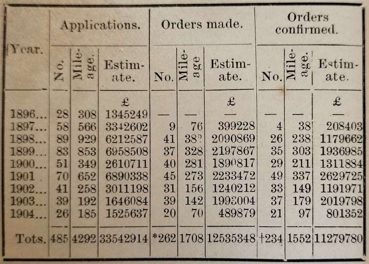 The short report in the August 1905 Railway Magazine highlighted the “number of applications made to the Commissioners in each year since the commencement of the Act, the number of orders made by the Commissioners, and the number confirmed by the Board of Trade, with mileage and estimates.” [1: p170]
