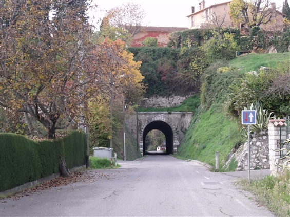 The tunnel is 860 metres long running in a predominantly westerly direction (from 43° 44’ 22”N, 7° 09’ 21”E to 43° 44’ 31”N, 7° 08’ 32”E) and the line appears again South of the D2210 road, south-west of Saint-Jeannet close to Le Peyron. From the tunnel mouth at the West end of the tunnel (visible below right) there is a short section of the route accessible with care and known as the Chemin de la Champignonniere. A high retaining wall (below left) carries the old line above the Ancienne Route de Vence which falls away to the West and meets the line at grade just behind the camera and then climbing away above the old line on its way towards Saint-Jeannet.