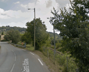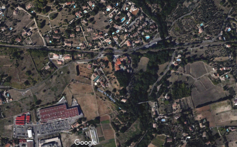 The route travels at relatively light grades down the towards Cannes. On the plan view from Google Earth, the point at which the two pictures are taken is in the North West corner. The line can be seen diverting southwards and following the Canal de la Siagne. After a while the line passed the Chateau de Mouans and arrived at the station of Mouans-Sartoux.