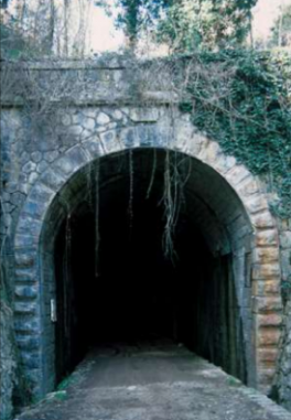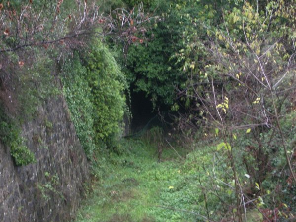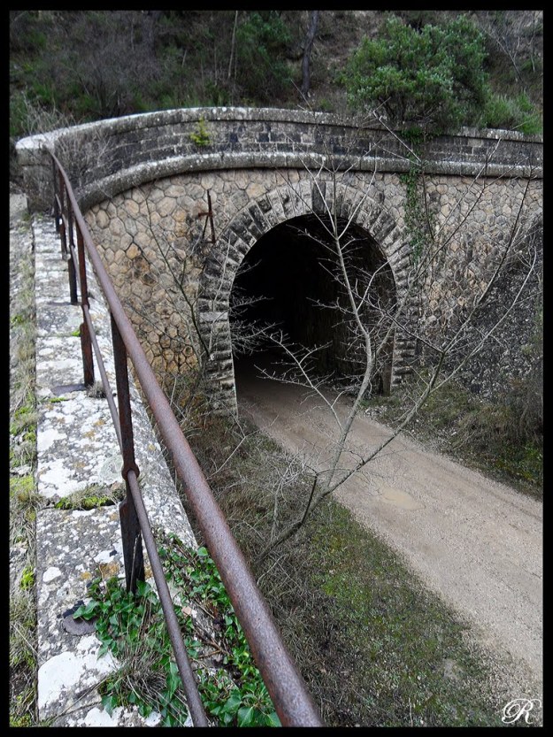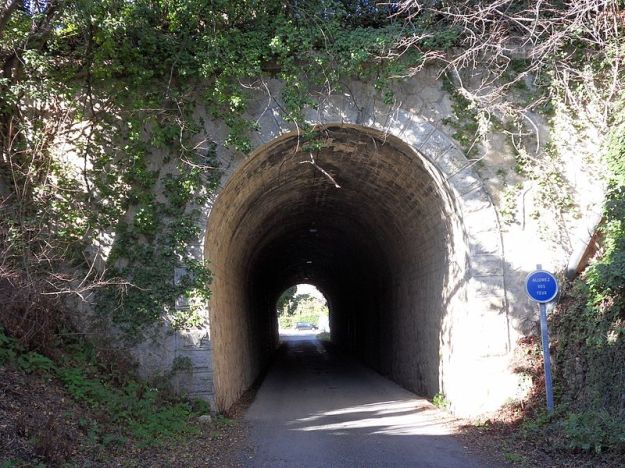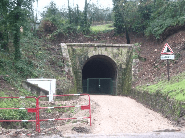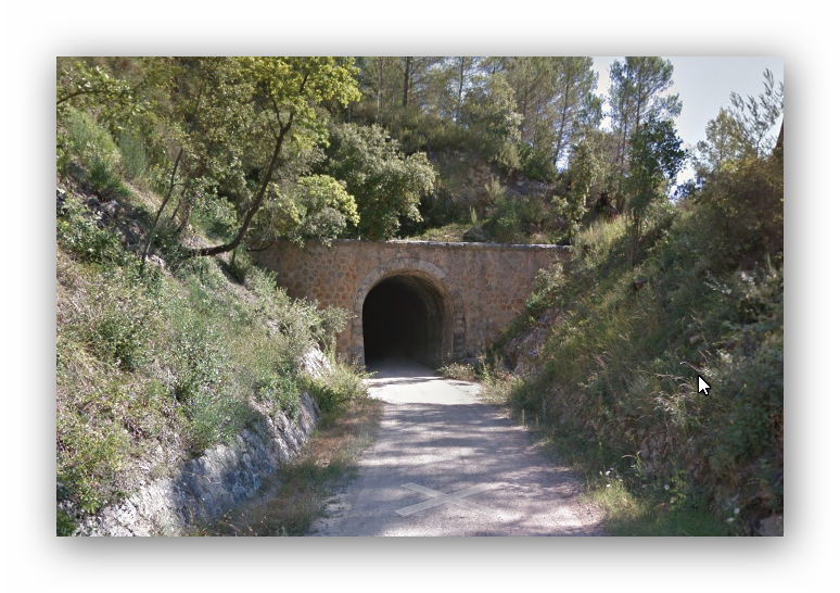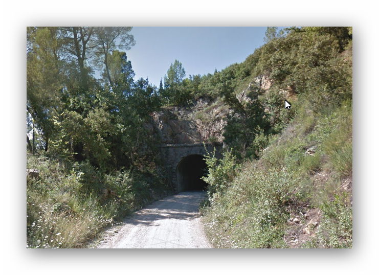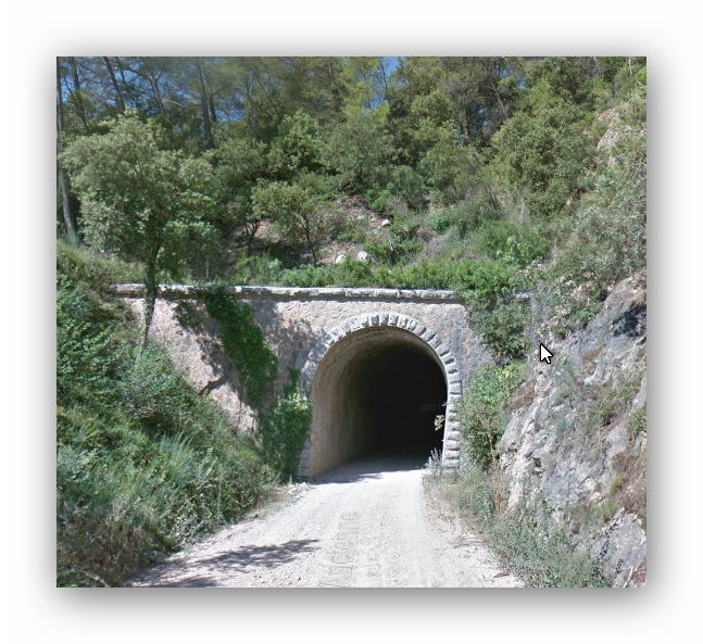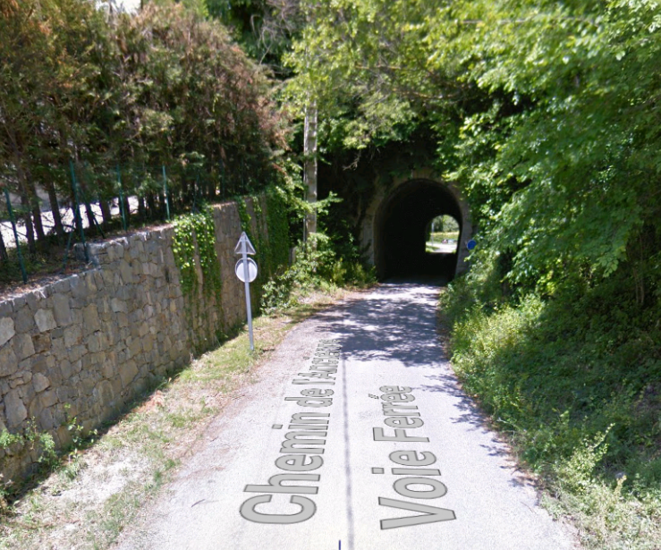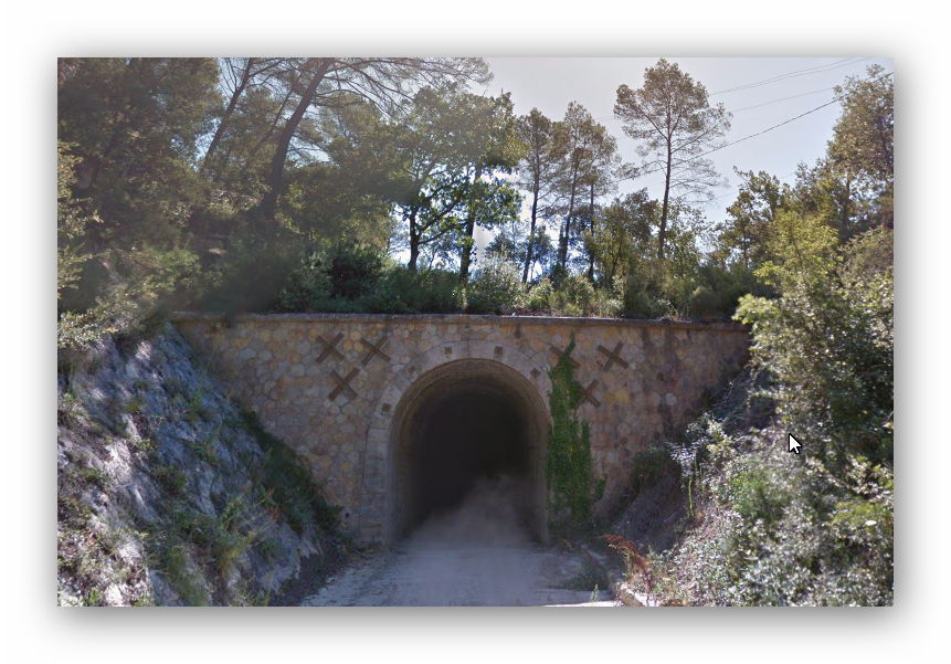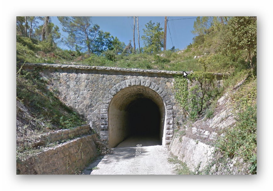 The route continues towards Varages and encounters a short tunnel. both the portals are shown below, together with a map which marks the tunnel with a black dotted line with arrowheads at each end. beyond the tunnel the line continues to follow Chemin de Varages-Pres, a gravel road based on the formation of the old line.