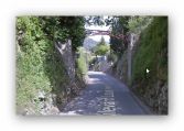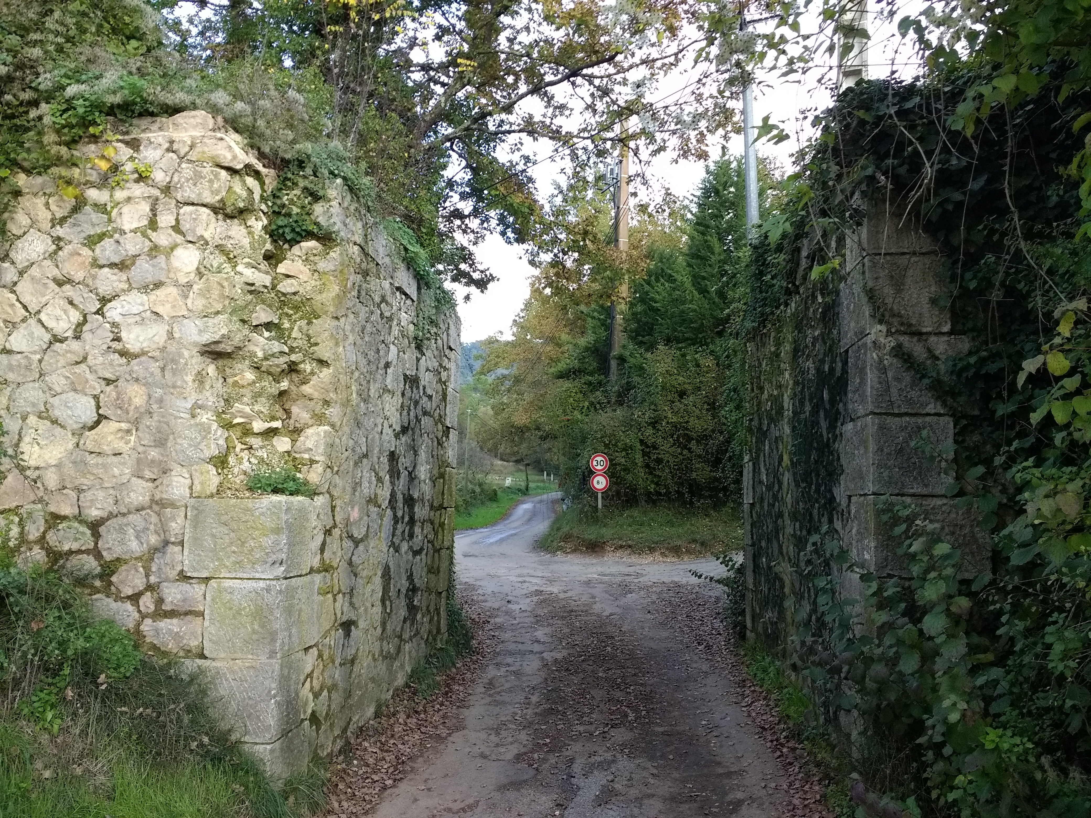 The line continues on towards Varages held high above the local road on a series of retaining walls. The road comes up to meet the railway and crosses it. There are two images below the one of the retaining wall which show the crossing, the first looking back down the line (the railway came down the track behind the green waste bin. The second image shows the formation and the road diverging again. The railway took the route on the left of the picture which is now covered in tarmac.