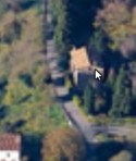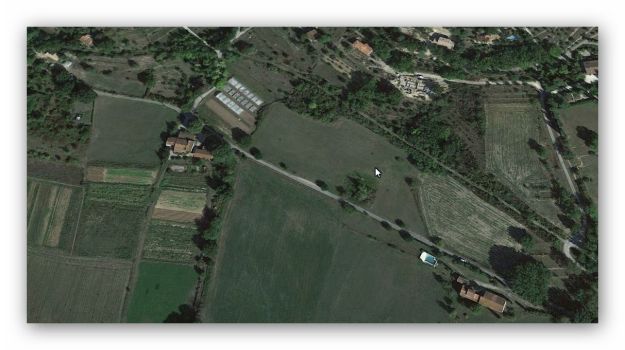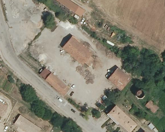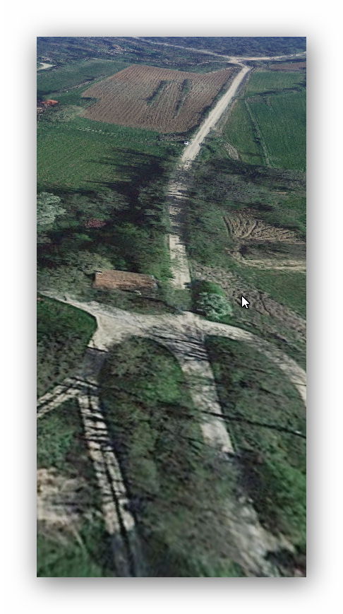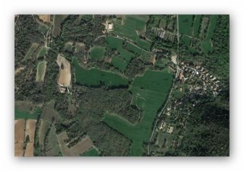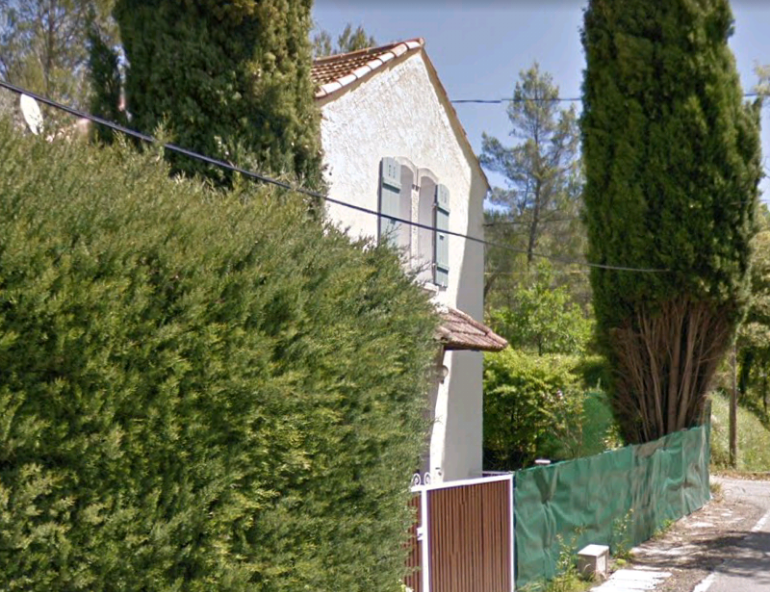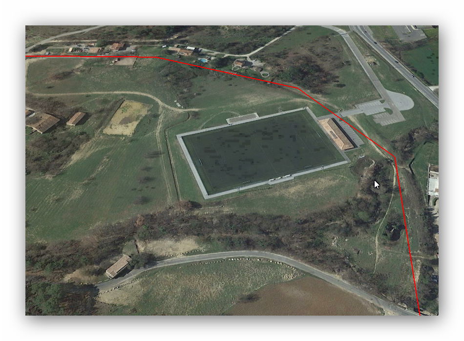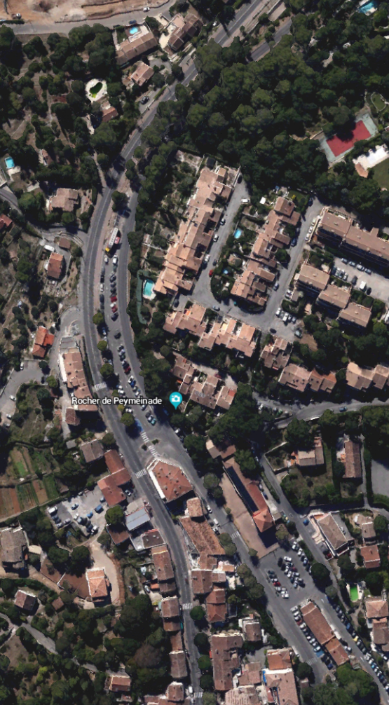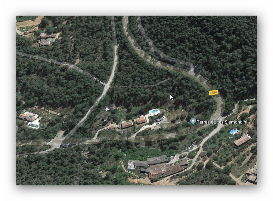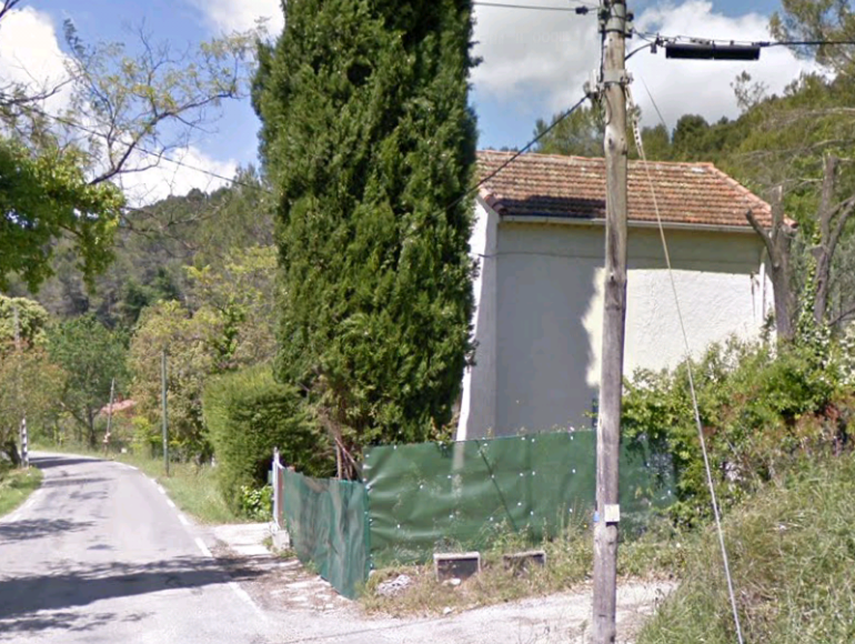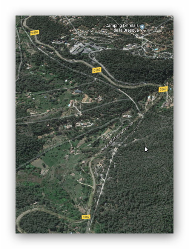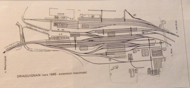 The aerial shot looks back down the line towards Barjols and gives a good impression of the scenery around the line. Hidden behind trees in the centre of the image is a crossing keeper’s cottage. the formation of the line is now overlain with a broken tarmac surface.
