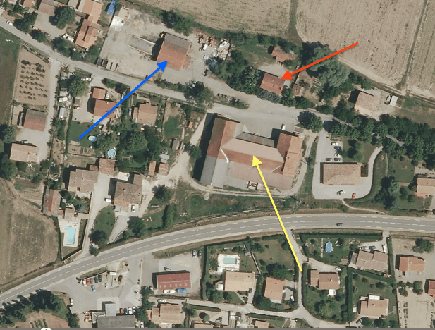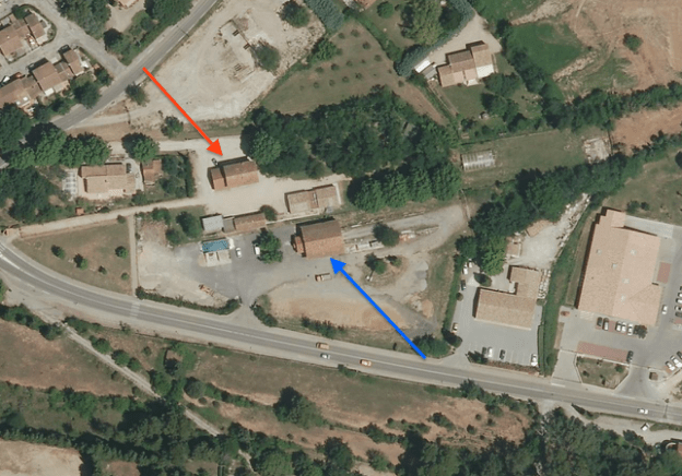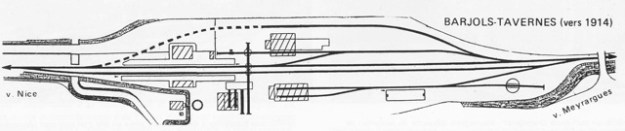 The “Rians et Artigues” winery was founded in 1922 and made use of the railway to transport its produce. I have found fiures for its operational capacity in 1979. That year it vinified 19,235 hectolitres of wine, including 574 hectolitres of AOC Coteaux d’Aix-en-Provence. It had 252 members who were then cultivating 296 hectares of vines. The building is marked with the yellow arrow. The passenger station building is marked with a red arrow and now-a-days hides behind a high hedge. The Goods Shed is marked with a blue arrow. The station site is marked with a red ellipse on the plan below.