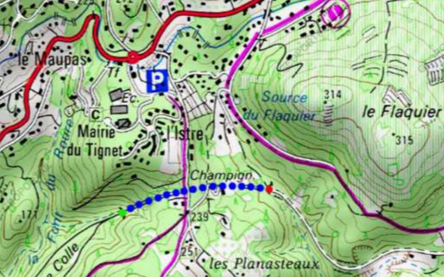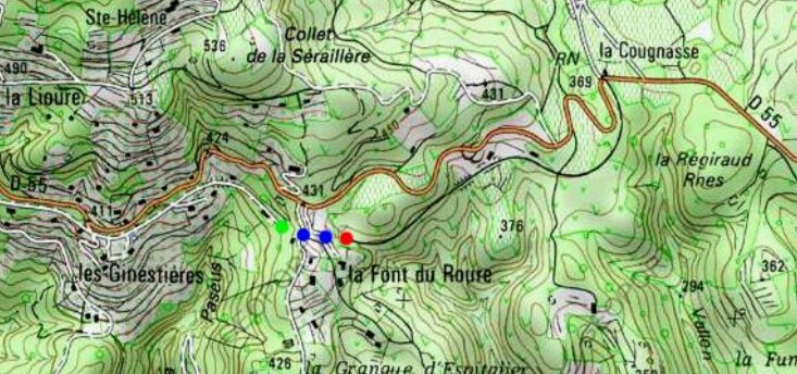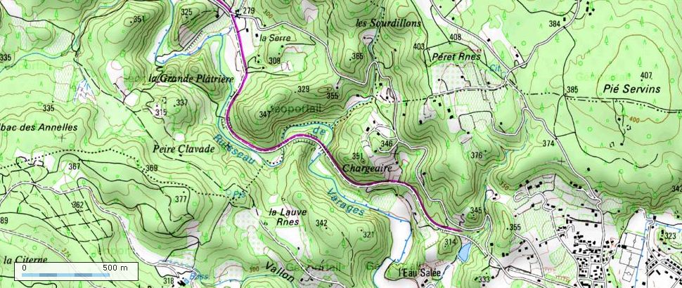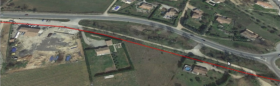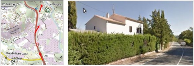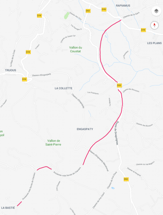 On the plan above, Esparron can be picked out in the bottom right and the route of the line runs from the top right to the top left. A tarmac surface means that it is easy to follow the route in a vehicle. We did this in November 2017.