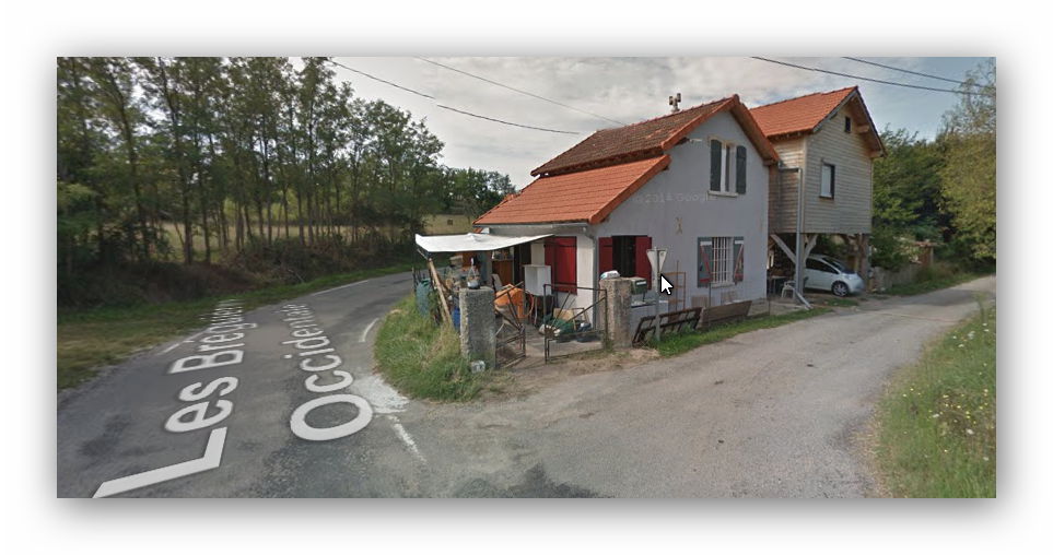 The private dwelling and gardens have been nicely restored. The line travelled between the two remaining structures, the station house and the goods shed. Even part of the station platform remains visible. The D70 was crossed at grade and the line headed on to meet the D561.