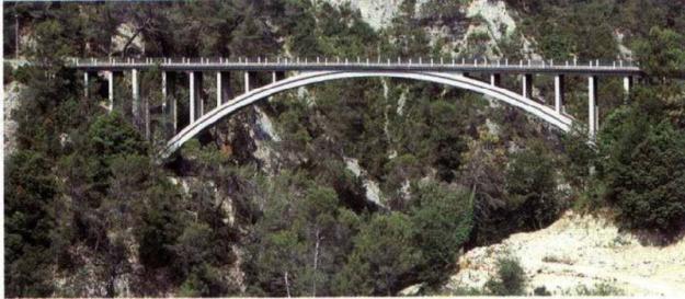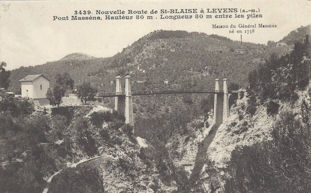 242T66 comments about the Masséna suspension bridge at Saint Blaise: “it dates from 1911 and was destroyed by bombing in 1944. Since 1953 it is replaced by a concrete bridge with a large arch. Given that an itinerary had been planned to pass the tram through Aspremont, Castagniers and St Blaise, which would have served a larger population but at the cost of a longer and more expensive line than that of the valley, it is possible to think that the road from St Blaise to Levens and the suspension bridge had been made with the idea of being able to pass the tram.”[3]
