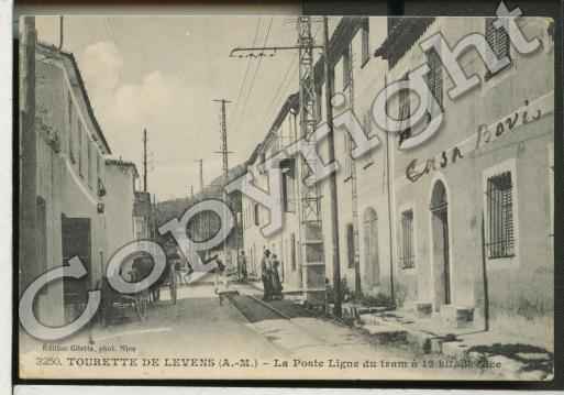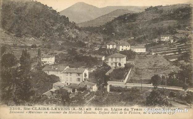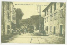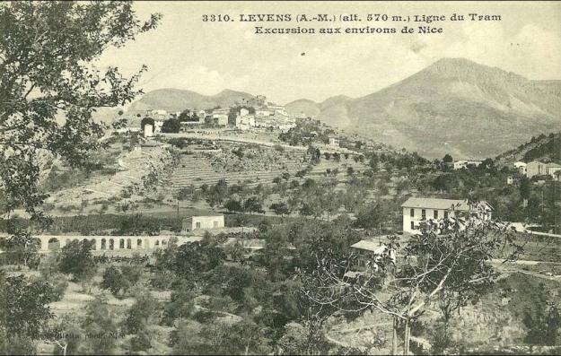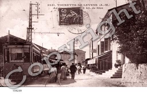 The actual tramway route followed what is now the M19. According to the works of Jean Robert [2] and José Banaudo,[1] the tram to Levens did not pass through Saint Blaise but followed, mainly on the shoulder of the M19, sometimes on the road and also a few kilometres on an independent formation. The route travelled through Moulins-de-Tourette, Tourrette-Levens, Laval and Ste Claire, to end at the place called Les Traverses, below the village of Levens. The line was put into service in June 1908.