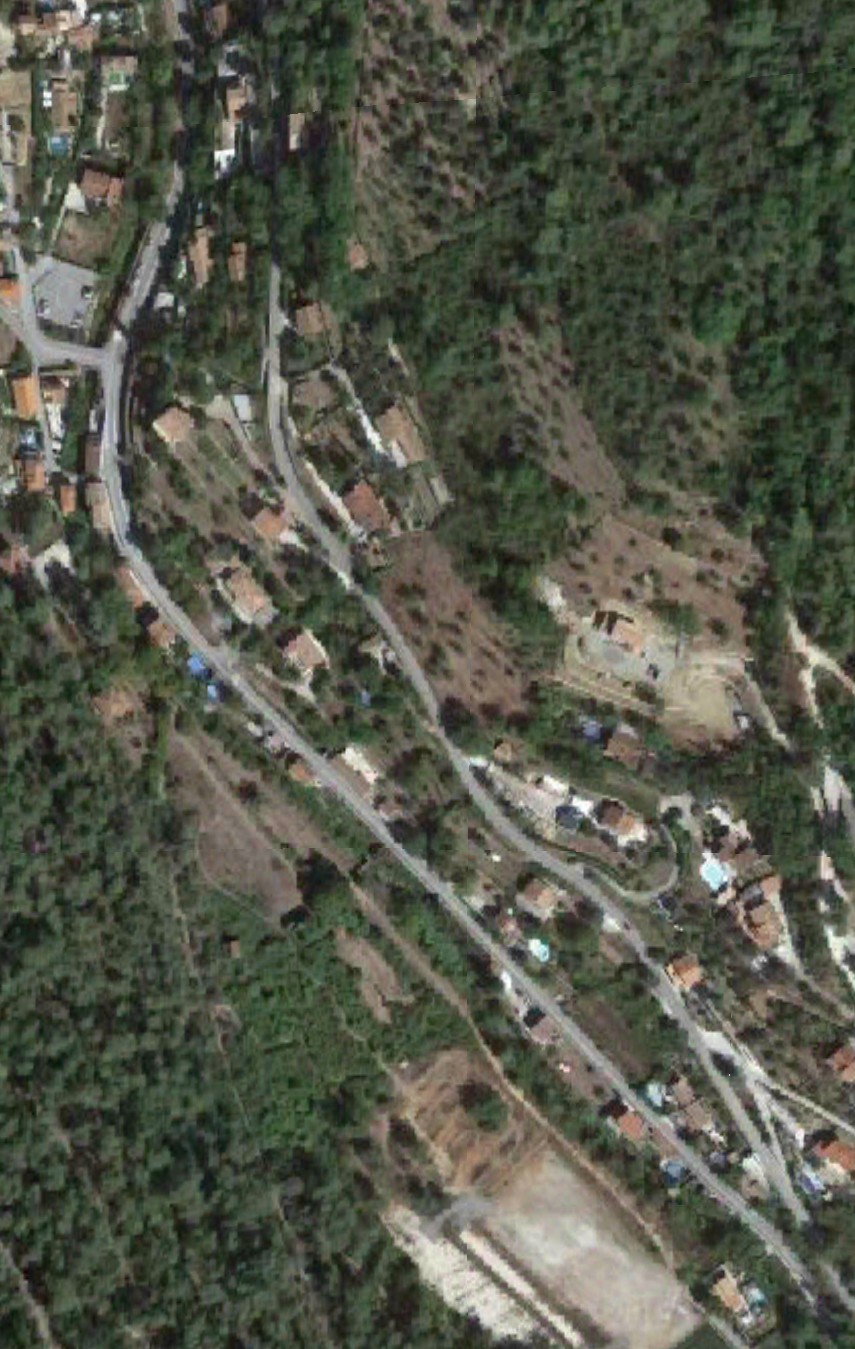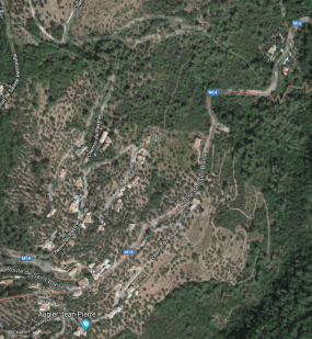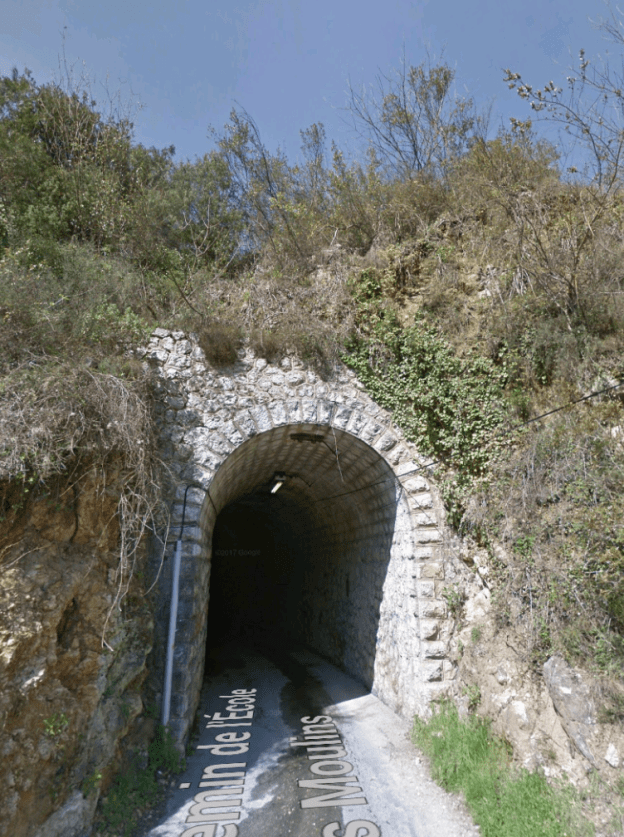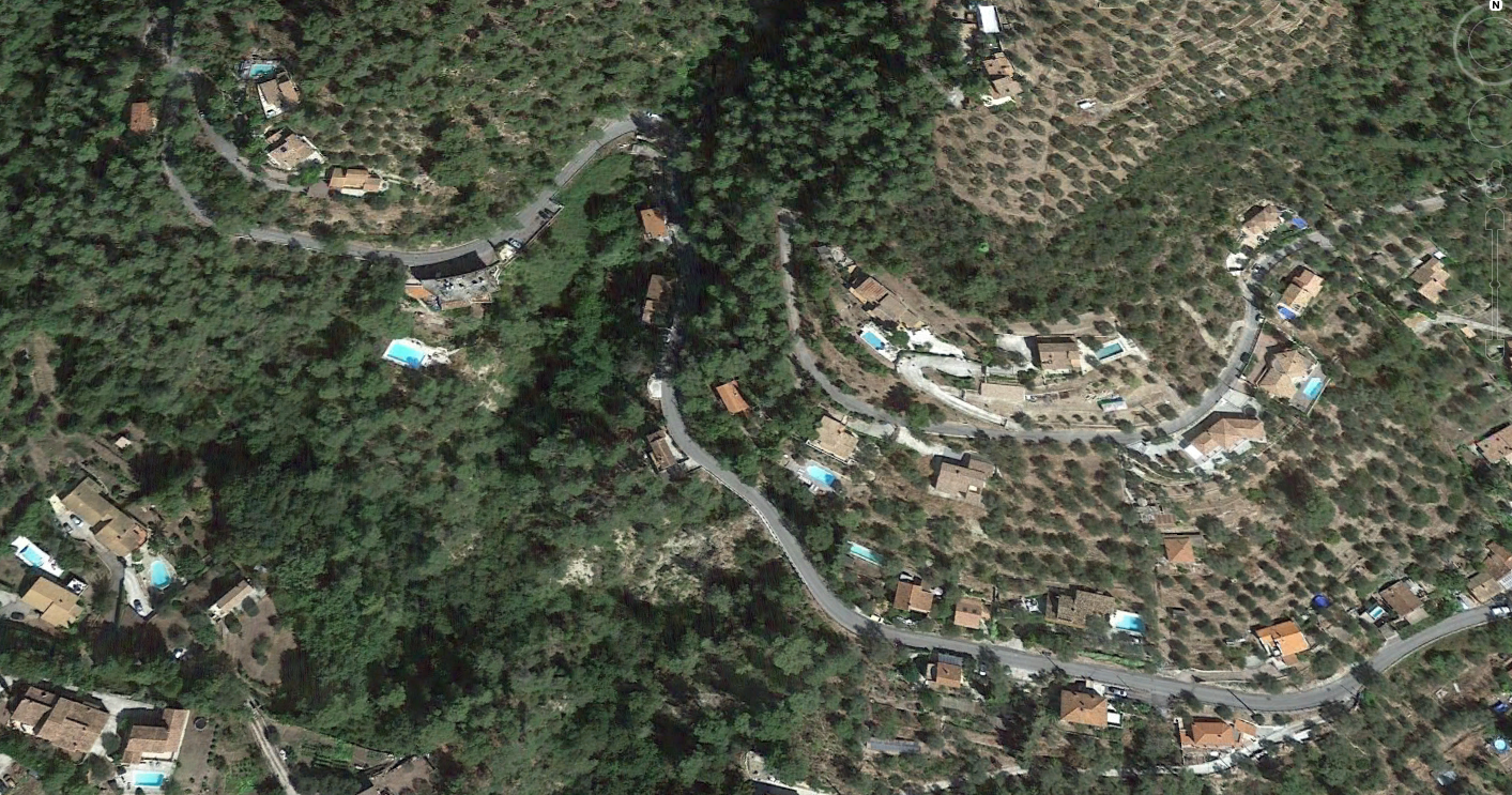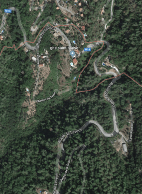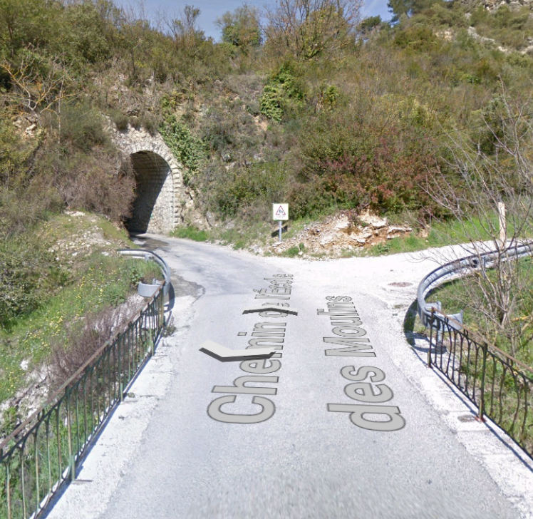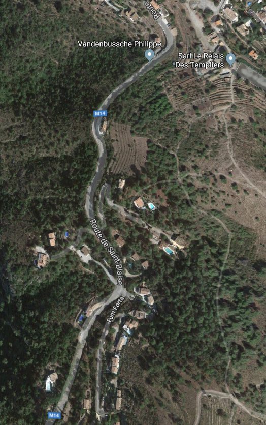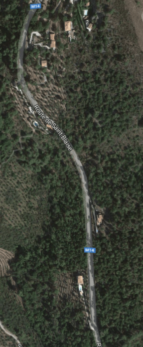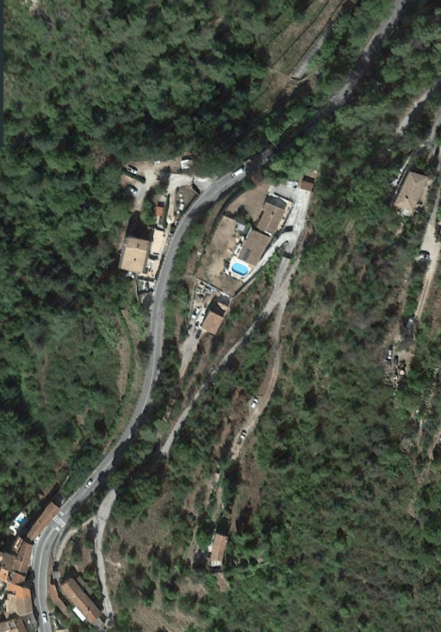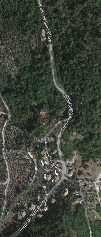 What might have been …………….. A relatively sharp left turn took the supposed tramway out of Tourrette-Levens towards Aspremont on what is now the M719. On the first satellite image below the junction can be seen middle-right and the rout heads up to the centre-top of the image before exiting top left. The two houses in the top-left corner of the image can be seen on the bottom-right of the following image, for a short distance the route travelled roughly in a Westerly direction before turning north to follow the contours around a small valley, then rounding a hillside before leaving the image close to the top-left corner. I ahve not been able to find any images which relate to the tram route between Tourrette-Levens and Saint Blaise and so am not able to be absolutely sure of the route, form this point on, however the lie of the land suggests that the tram will have followed what are now the roads linking Aspremont and Saint Blaise.