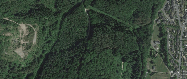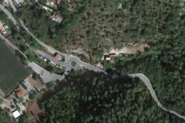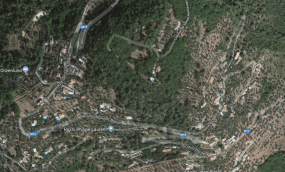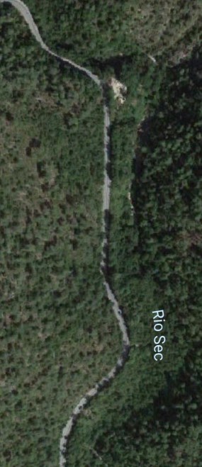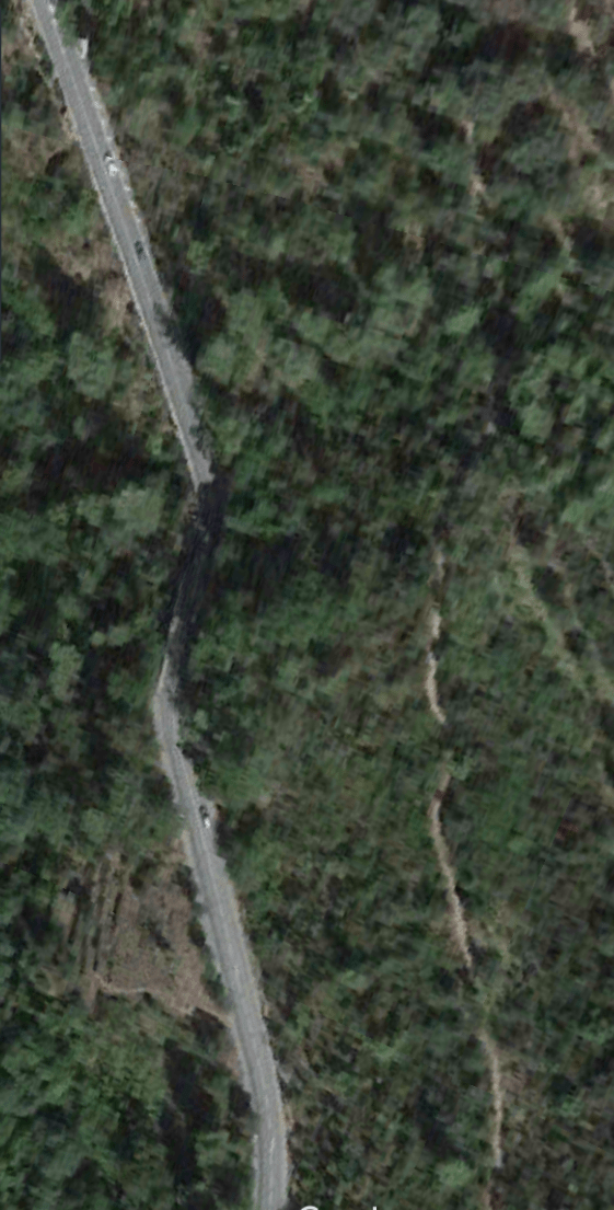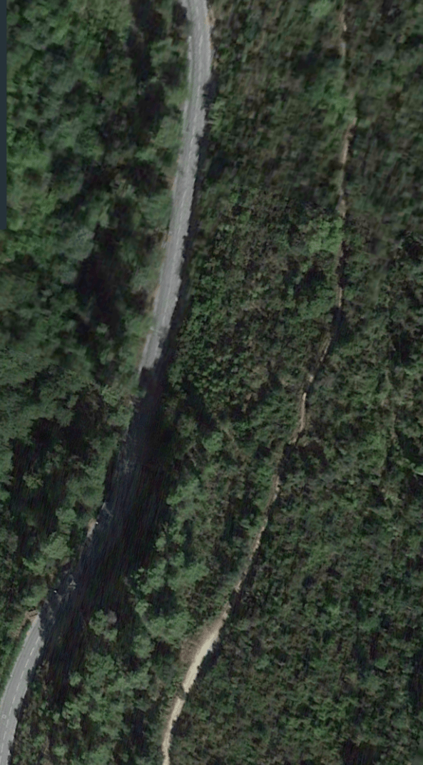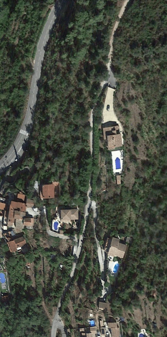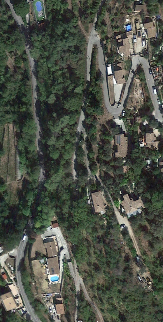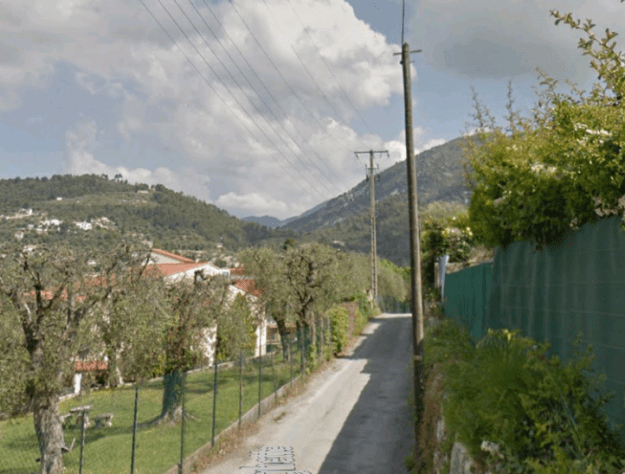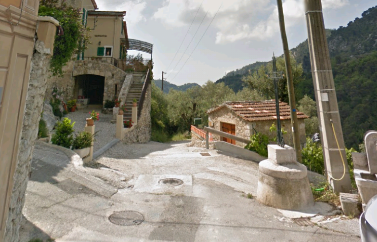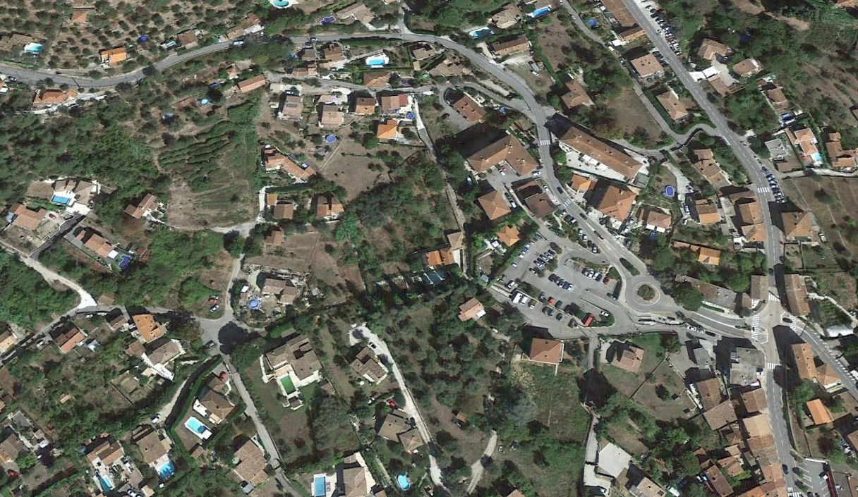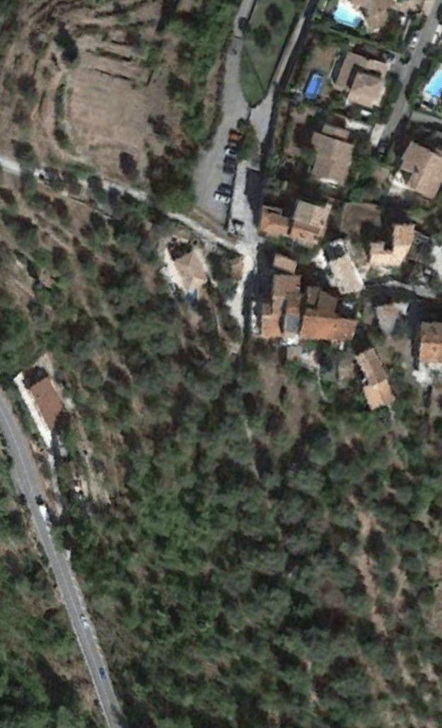 What might have been …………….. A relatively sharp left turn took the supposed tramway out of Tourrette-Levens towards Aspremont on what is now the M719. On the first satellite image below the junction can be seen middle-right and the rout heads up to the centre-top of the image before exiting top left. The two houses in the top-left corner of the image can be seen on the bottom-right of the following image, for a short distance the route travelled roughly in a Westerly direction before turning north to follow the contours around a small valley, then rounding a hillside before leaving the image close to the top-left corner. I ahve not been able to find any images which relate to the tram route between Tourrette-Levens and Saint Blaise and so am not able to be absolutely sure of the route, form this point on, however the lie of the land suggests that the tram will have followed what are now the roads linking Aspremont and Saint Blaise.