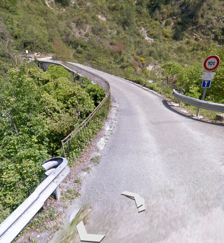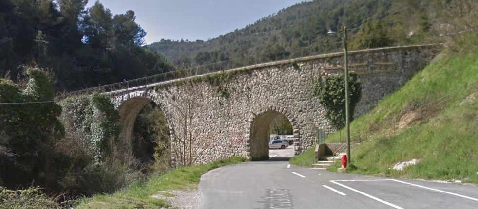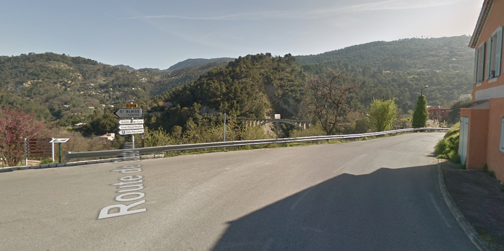 As the trams approached St. Blaise they were still running on a downward ruling grade and had to negotiate two hairpin bends as they approached the village. The tramway stayed above the village itself heading for what was in its day a suspension bridge carrying the route over the valley of a fast flowing tributary of the River Var. The replacement bridge can be seen in the google streetview image below.