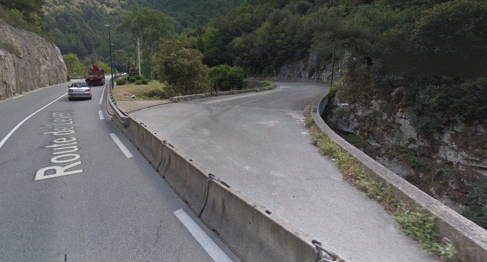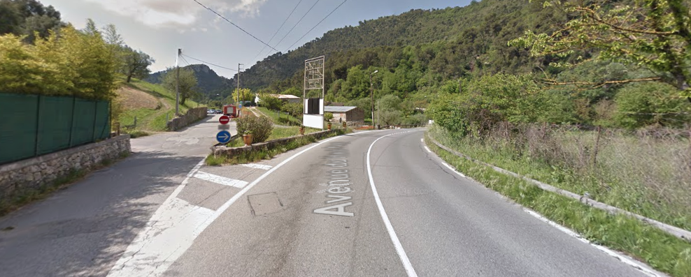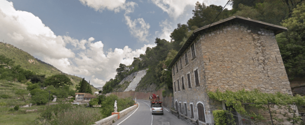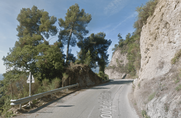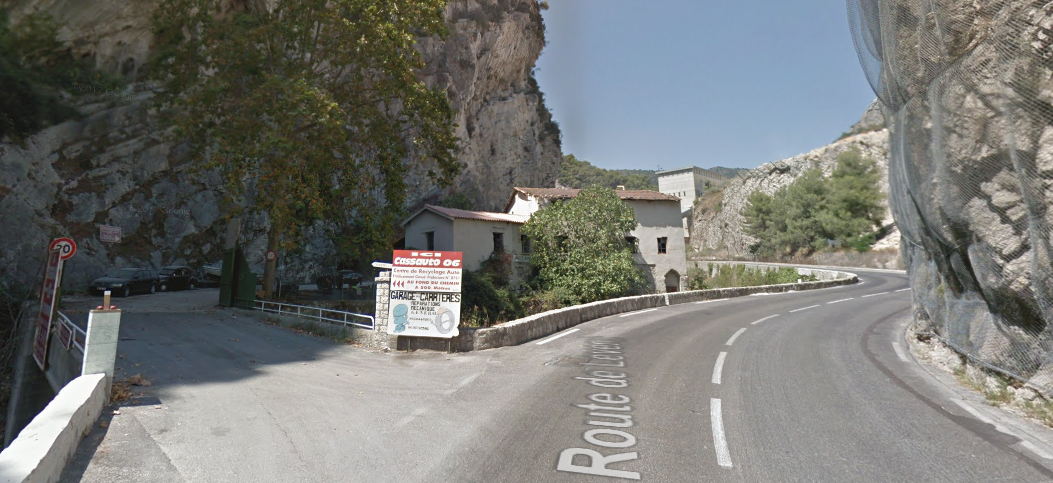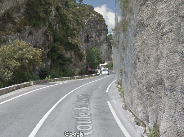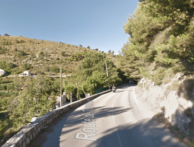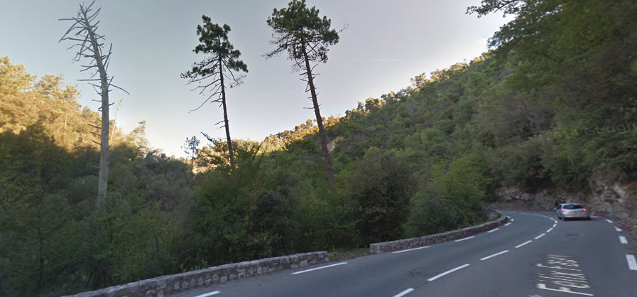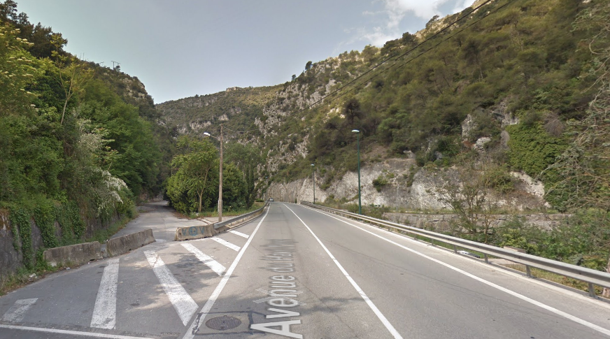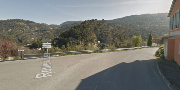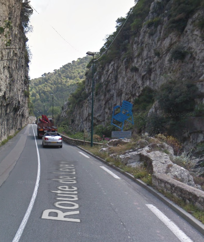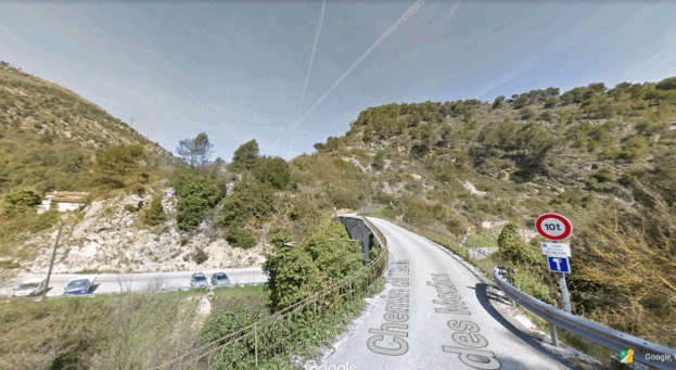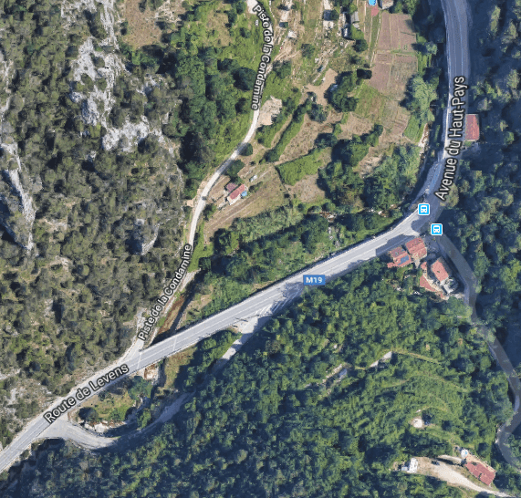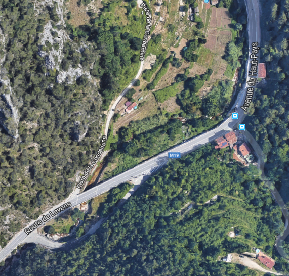 The M19 is known as the Avenue du Canton de Levens and swings north as it meets the valley of the Rio Sec. It runs high above the river in the valley below. It then crosses the river and travels on its North-East bank, towards La Columbier