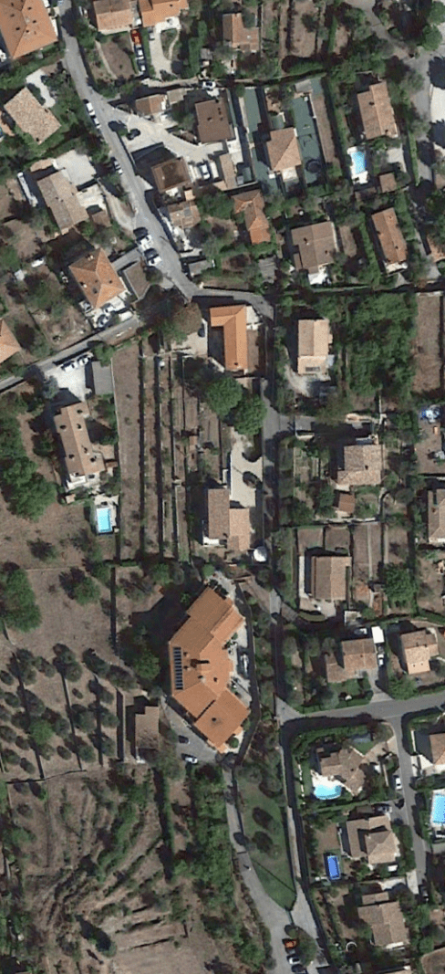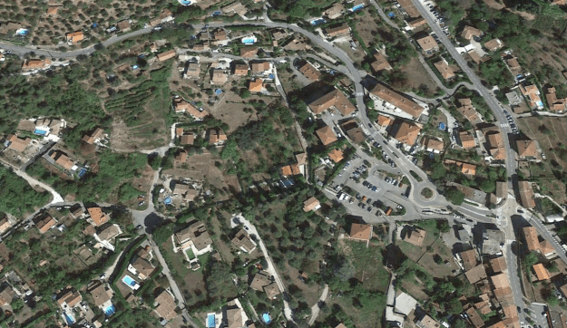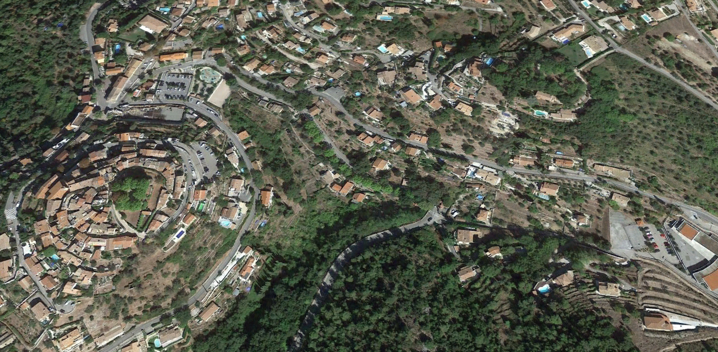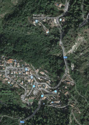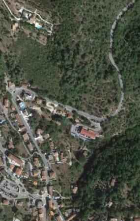 Aspremont is to the left of the satellite image below and the tramway route comes in on the right of the image just below centre. It approaches the perched village curving southwards before taking a hairpin turn in the market area of the village before heading northwards on the Route de Castagniers.