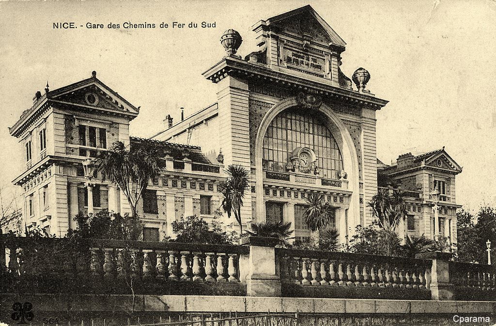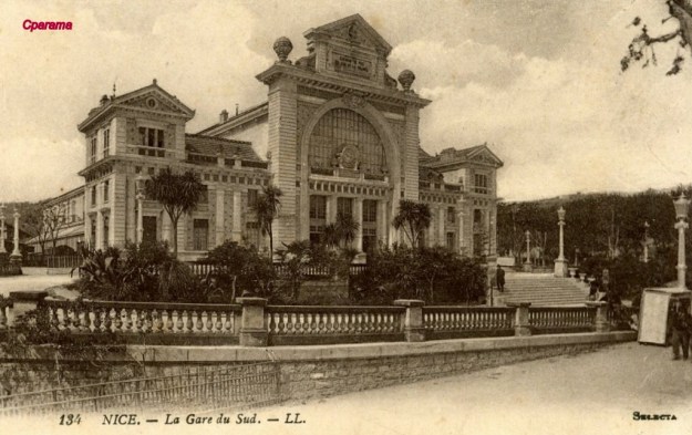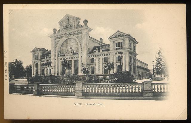Our journey starts in Nice at the magnificent facade of la Gare du Sud. First a few older postcards to introduce us to the station. ……..