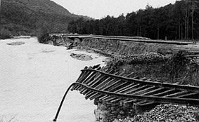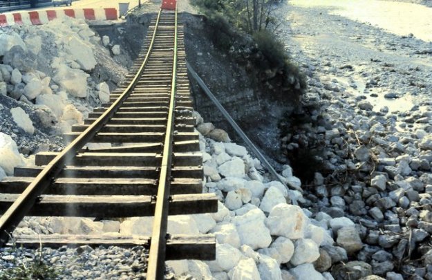 However, exceptionally bad weather and flooding in the Autumn of 1994 (5th November 1994) resulted in the River Var carrying away significant lengths of several hundred metres of the Nice to Digne line. The CP took over 18 months to repair the line and recover.[6,11,12] The images below show examples of the damage caused in the November 1994 floods.