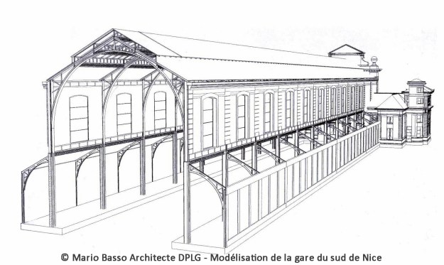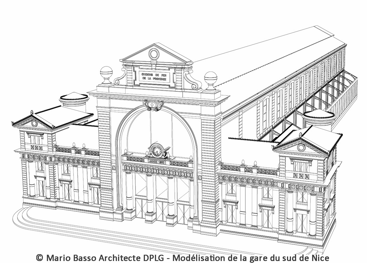 This demolition raised many protests and finally the Minister of Culture , Renaud Donnedieu de Vabres, opposed it in 2004. Meanwhile, the facade of the old station was registered as a historical monument on 23rd September, 2002.[27] The train-shed was registered as a historical monument in June 2005. The elegance of the building is demonstrated by the following images draw by the Architect, Mario Basso.[28]