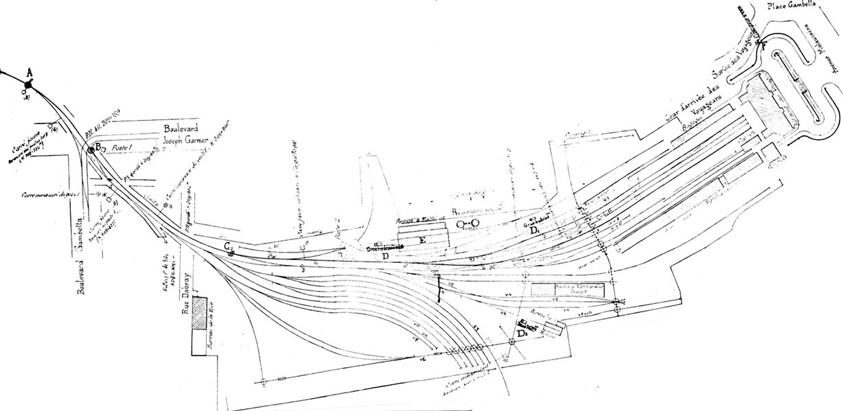 In 1976, access to the station was compromised when the City connected the streets of Alfred Binet and Falicon. Access to the goods hall and shunting manoeuvres became almost impossible. On 22nd March 1977, the automatic gates of Gambetta, Cros de Capeu and Gutemberg Streets were removed and replaced by traffic lights![21] This meant that trains were restricted to a speed of 4km/hr when crossing those streets.