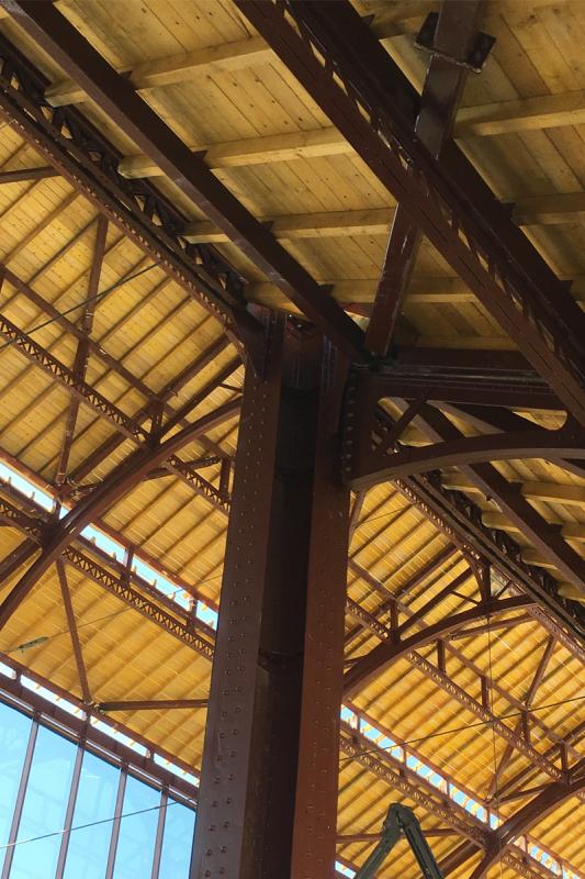 Trackside, there was (and is) a large train-shed, 23m wide, 18m tall and 87m long which covered the platforms. It is a metal structure inspired by the work of Gustave Eiffel which was originally used to house the Russian pavilion of the 1889 World Fair.