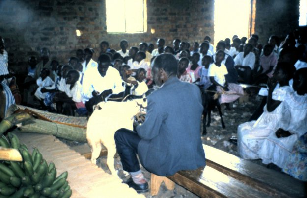 Jo’s strongest memory of Katwekamwe was that this was the place where she first experienced an auction after the morning service. Many gifts from local people were made in kind and then at the end of the service they were auctioned off to add to the value of the Sunday collection! The next couple of pictures come from that auction in 2001! At the time, the church had no window glass and no floor. The auction raised some money towards the cost of a floor.