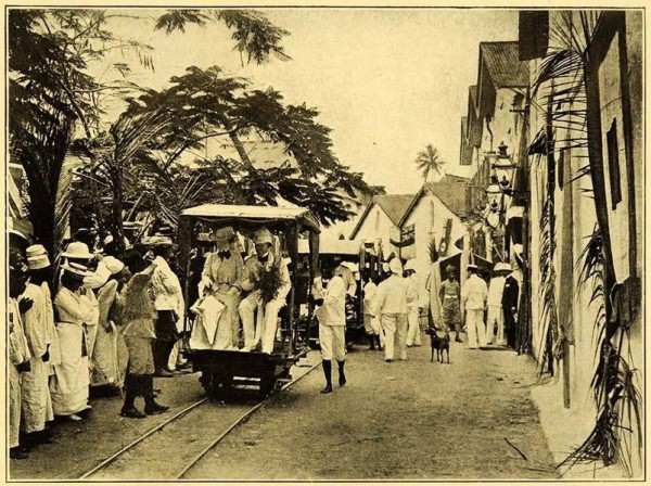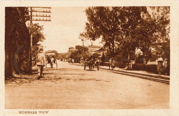 I came across some photographs while doing some research for my posts about the Uganda Railway. Further investigation led to a discovery of a very early tramway system in Mombasa. The adjacent image was one of these. There are clearly a set of tracks running on the streets of Mombasa.