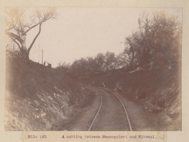It was given the very ambitious title of the “Central African Railway”, and as a symbol of the good intentions of the IBEA to open up the hinterland, sounded very impressive., but the venture got no further than seven miles (11.2 kms) before work stopped. Although it covered no more than a tiny fraction of the distance to Lake Victoria and the source of the Nile, the “Central Africa Railway” did secure a place for itself in history as one of the first railways to be built in East Africa, albeit no wider than two feet (61 cms) gauge. The tracks were later pulled up and, together with some of the unused rails, were re-laid to form the trolley line on Mombasa Island. Until 1923 this line was mainly used by Government officials, the more senior of whom had their own trolleys and received monthly allowances to pay the Africans employed to push them.