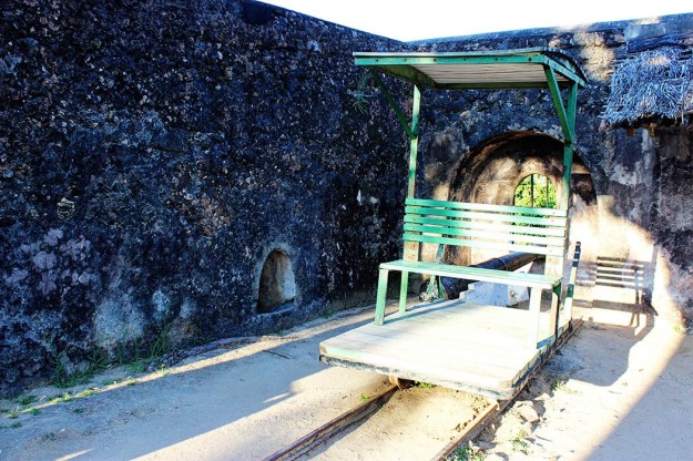 A replica trolley stands in the courtyard of Fort Jesus, on some reconstructed original line.[2]