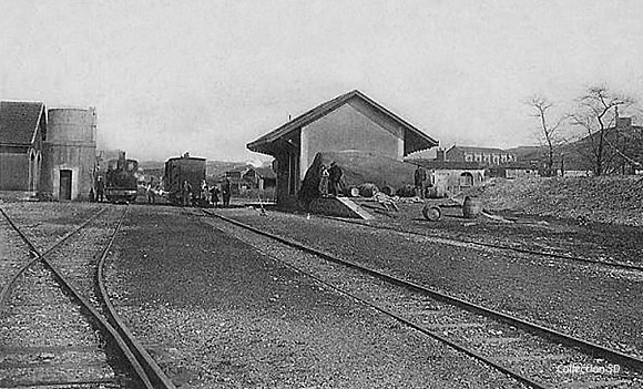 The Belpech station is located at 40.5 kilometer point. The waiting train is consisting of the No. 26 locomotive, a coach and a van. The train is located on one of the two tracks equipped with turntables which allowed access to the engine shed which is located behind the water tower. The water tower on the left, the station in the centre, and the hall on the right offer a complete picture of Belpech railway facilities. [12]