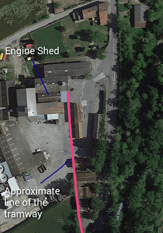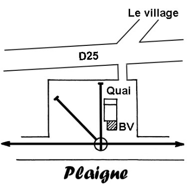 The pink line above shows the tramway route. The village of Plaigne is immediately to the south of the satellite image. The station building stands isolated just to the south of the tramway alignment. The adjacent sketch plan shows the limited facilities at the station. [4] The plan is inverted with North at the bottom.
