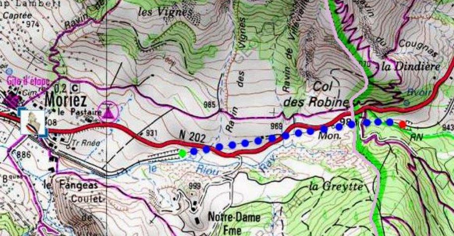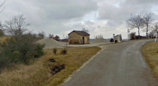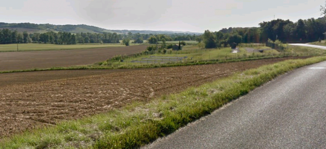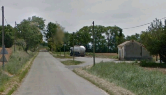 Close to Plaigne, the tramway formation and the IC25 (D25) diverge for about 700 metres. The small station building remains in the middle of a field to the north side of the D25. The line of the Tramway runs to the left of the fence in the centre of the image below. The station building can be picked out at the centre top of the picture with the Cyprus conifer adjacent to it. The image comes from Google Streetview.