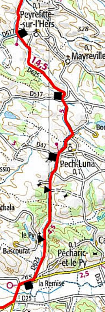 The next stop at Mayreville served a similarly small hamlet which, like Pech-Luna, was situated to the east of the road. Pech-Luna is a hamlet of around 100 persons, Mayrevellie, of around 70. [9] Peyrefitte-sur-l’Hers is a hamlet of about 75 people. [10]