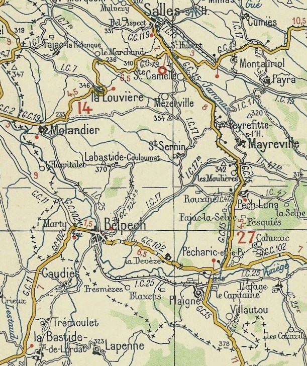 There were halts or stations at Belpech, Tresmezes, Blazens, Plaigne, Pecharic-le-Py, le-Py, Pesquiès, Pech-Luna, Mayreville, Peyrefitte-sur-l’Hers, Sainte-Camelle, Saint-Hubert on the way from Belpech to Salles-sur-l’Hers.