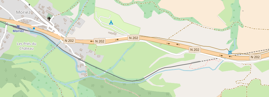 The 1930s Michelin map below shows the tramway marked as a castellated black line alongside the IC25 (now D25) south of Belpech and on the south side of the River Vixiege. Careful study of the map allows the station site in the village to be picked out. [5] Leaving the station the tramway ran on the west side of the IC25 for a short distance before crossing to the opposite side of the road just before it turned eastward. The trams then ran on the north shoulder of the road until it met the GC15 at Plaigne. On the way they passed through the halts at Tresmezes and Blazens.
