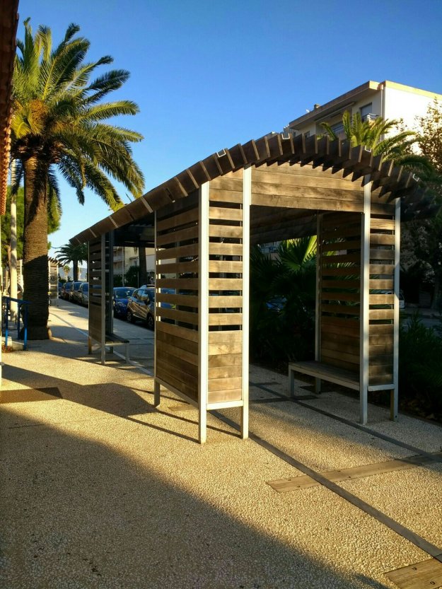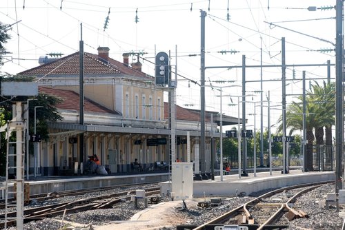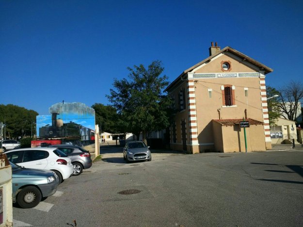 This tram has travelled from Ouveillan and will go on through the village of Cuxac d’Aude to Narbonne. It obscures the view of the station building. [3]