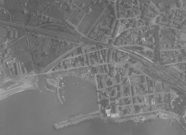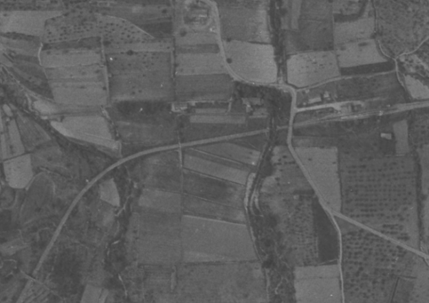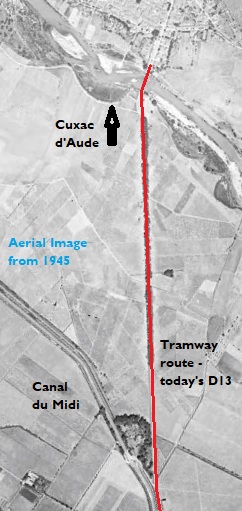 The tramway alignment was approximately as shown on the aerial photograph from 1945. The bridge over the River Aude can be seen clearly in the aerial image just at the point where the tramway reaches the village of Cuxac d’Aude.