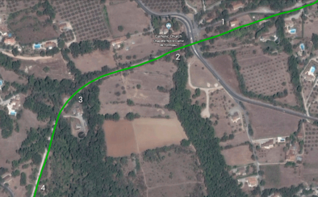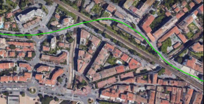 This image shows a tram further along the route to Ouveillan (Line No. 3 above). It has reached the point on its route which is furthest to the Southwest and is now passing under the standard gauge line before turning Northeast. [9]