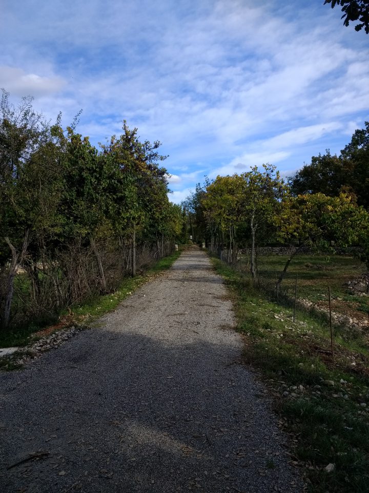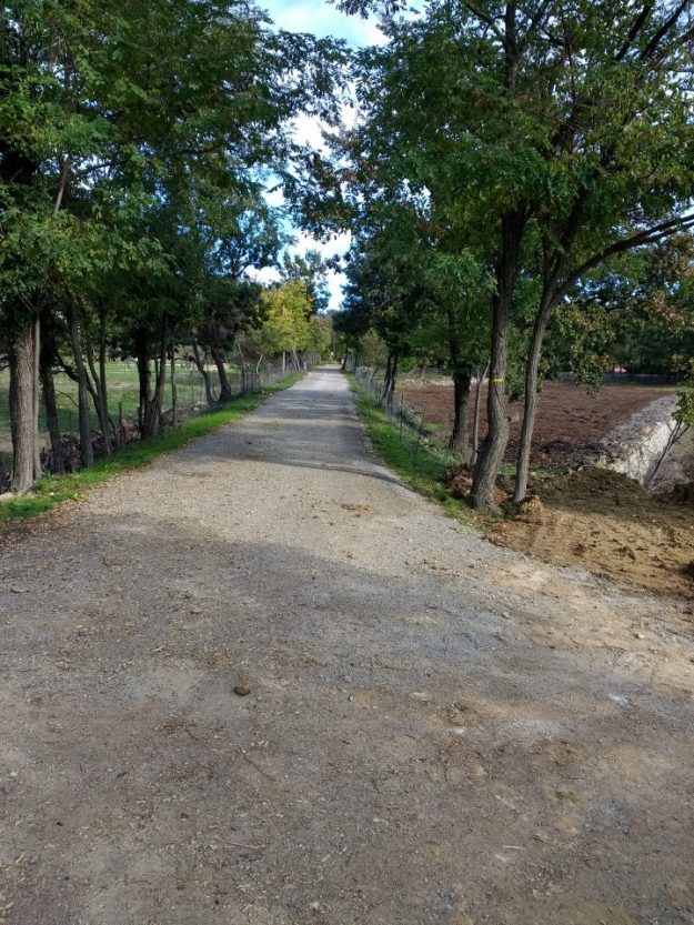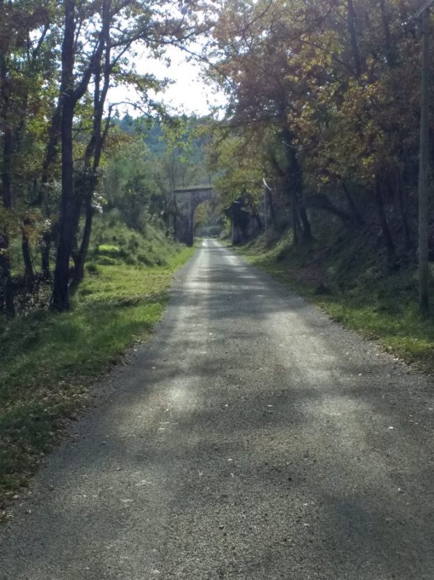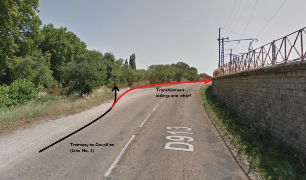 This Google Streetview image shows the line of the tramway to Ouveillan in black and the approximate line of the route into the transshipment yard and wharf in red. In this post we are following the black arrow!