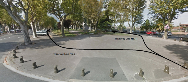 The tram (above) leaves the station and heads Southwest. It follows this route to the East of the Statue des Combatants. [7]