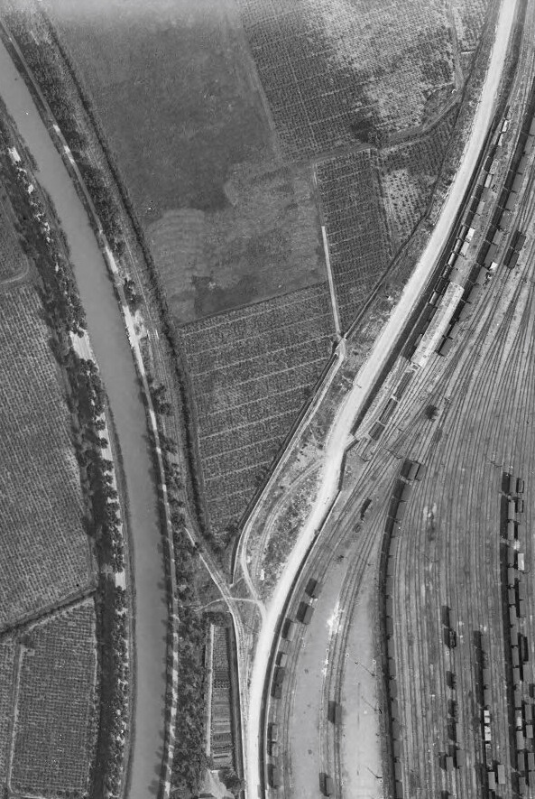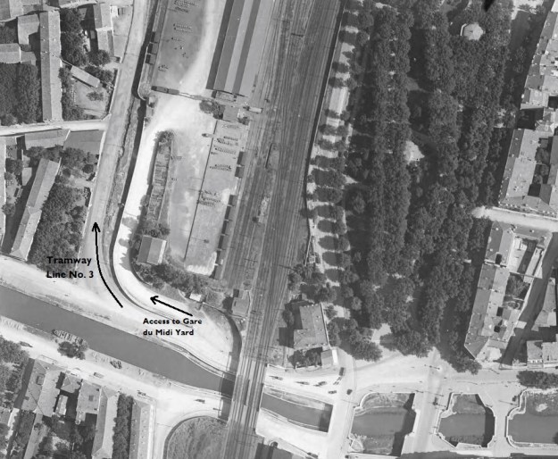 The monochrome images above have been aligned to show the tramway running up and down the photograph. It actually ran in a more northeasterly direction. The tramway followed what is now the D913 Rue de Cuxac along the western side of the large standard gauge facilities until it reached a branch to a series of sidings and a transshipment wharf/shed. At this point the mainline drifted to the West to follow the line of the Canal du Midi. It can be seen running towards the top left of the picture above. [17]