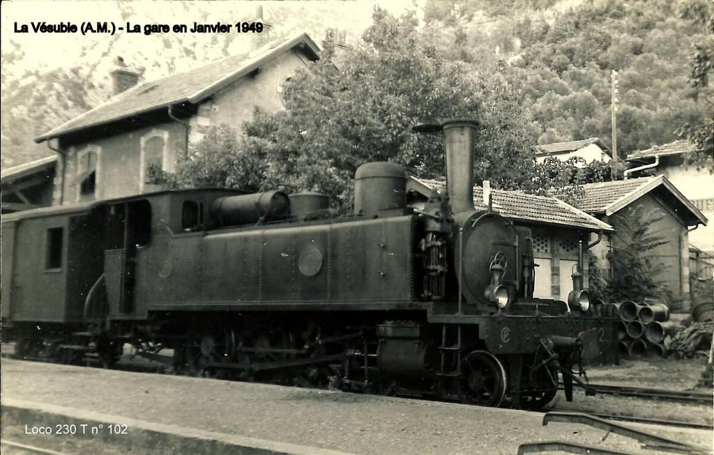 It is difficult to distinguish between the different 4-6-0T locomotives on many of the postcard images available today. For example, there are two images of the La Manda Station near Colomars below. In the first image it appears that the locomotive is a 4-6-0T but the resolution of the image is not good enough to determine whether it was made by Pinguely or SACM. The second image appears in Jose Banaudo’s book [3] and on the CPArama website. [4] Banaudo highlights the fact that the locomotive in that image is a 4-6-0T but does not clarify which manufacturer. He does draw attention to the flat wagon at the left of the picture which he says must have come off the TAM network because of its narrower loading gauge.I have been consulting with 242T66 on “Les Passions Metrique et Etoile!!” Forum [9][12] about some of the photographs in this blog. They comment that it is likely that the locomotive in the second image is an type E 4-6-0T because the type F had an air-compressor fitted to the right-hand side of the smokebox. It is possible that the locomotive is a SACM Series 81-86 rather than a Pinguely locomotive.NICE (AM) – Locomotive No. 102 tows freight train at La Madeleine station – Photo Card. The locomotive No. 102, type 4-6-0T, was built in 1908 by the French Society of Mechanical Engineering (SFCM) – Cail in Denain (North). It was delivered on July 6, 1911 to the Railways of Provence – It was part of the series Nos.101 to 105 – After a career of more than 40 years, having traveled 752,362 km. this loco was stabled in 1952 and scrapped on 24th March 1954. [3][10]Another view of the 4-6-0T locomotive No. 102, at the station of La Vésubie in January 1949 – Photo card. (Bernard Roze collection). [10]This picture shows the official reception train headed by 4-6-0T Pinguely No. 94 on 30th September 1907, the trucks on the left belong to the contractor, Entreprise Orizet. The station is La Gare du Pont de Gueydan. [3][5][12]In this view, taken sometime between 1908 and 1911 .an unidentified 4-6-0T (I think) approaches Annot Station from Nice. At this time the middle section of the line between Annot and Saint-Andre-des-Alpes was still under construction. [3][7]A train for Nice headed by 4-6-0T SACM No. 83 at Annot Station. [3][12]What appears to be a 4-6-0T locomotive stands at Thorame-Haute. The picture is not clear enough to identify the locomotive. [6][12]An unidentified 4-6-0T also standing at Thorame-Haute. Although the picture is present in Jose Banuado’s book the locomotive is not identified by him. [3][6][12]