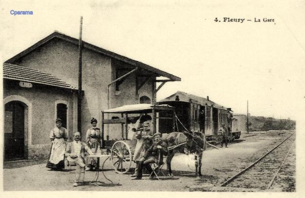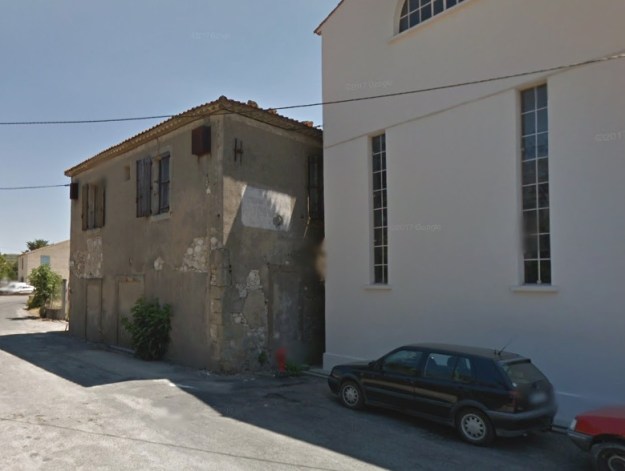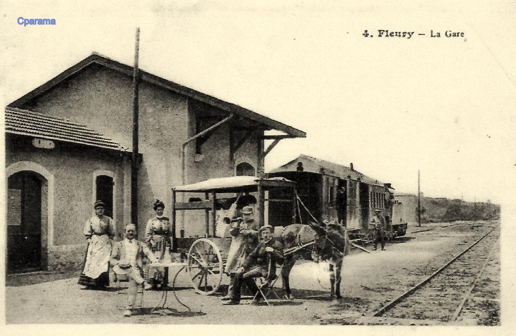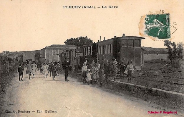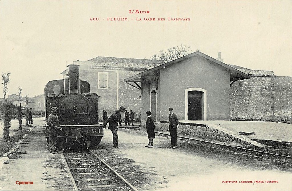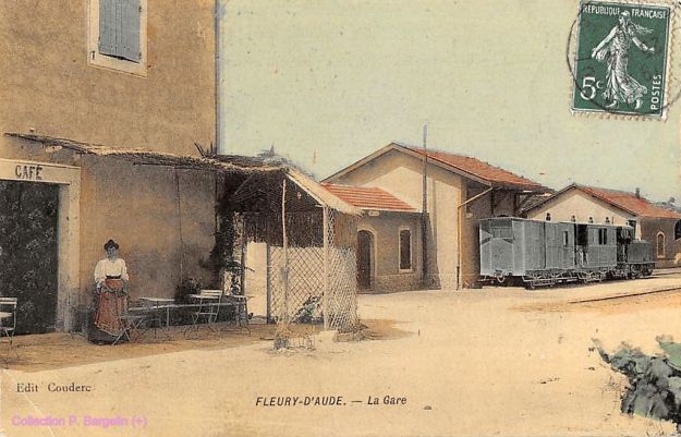 The centre of the village of Fleury d’Aude is shown below on the next 1945 aerial image. The central circular area of the old village is typical of many such villages in Southern France. The smaller aerial image above was taken at the same time as the one below and abuts directly onto it.The station was out to the West of the centre of the village. The building in the bottom right of the green rectangle appears in a number of the pictures below. It is at the right-had side of the sketch plan below, just beyond the station site boundary on the sketch. It can be seen beyond the tram in the first postcard image below. [5]The station at Fleury d’Aude. [6]Corpet-Louvet 0-6-0T No. 1 at Fleury d’Aude Station. [6]The two images above show the building referred to in the last paragraph above. The first is a closer image of the building on an early 20th century postcard the second is taken in the early 21st century.The station cafe and passenger and goods facilities. The engine shed is visible behind the locomotive which is preparing to leave for Narbonne. [6]The cafe building in the early 21st Century with the modern Co-op buildings on the site of the station.Fleury d’Aude Station. [6]
