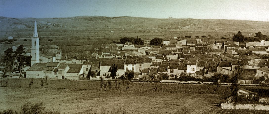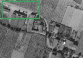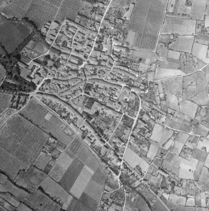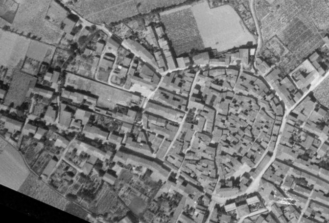 This 1945 aerial image shows Salles d’Aude and the road which is now the modern D31 crossing the lower half of the old village from West to East, entering immediately below the woodland in the top left of the image and exiting off the bottom edge of the image close to the right-hand corner. The vestiges of the tramway route can be seen to the south side of the properties which flank the road [1]This picture is taken from South of the village and shows the tramway route on embankment in front of the village. It runs approximately along the line of what is now Rue du Grimal. [4]