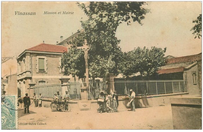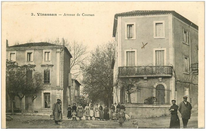 This is a close-up image of the top right of the above ‘snake’ illustrating the length of the route to Vinnasan from Narbonne. The tramway by-passed the centre of the village, taking a more easterly route than the main north-south road through the village (now the D31).The postcard images above come from the central area of Vinnasan, both taken from the main north-south road which is now the D31. They are matched to modern images which show relatively little change. [2][3] The tramway ran to the east of the main village road.