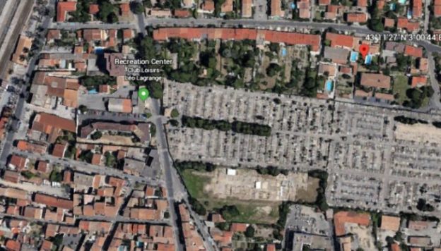 It was only a short distance from Salles d’Aude to Fleury d’Aude. Tha station at Salles D’Aude was at the topleft of the satellite image below. The tramway route is shown in red and the location of the station at Fleury d’Aude is shown with a green box both on the satellite image and the aerial photo below.