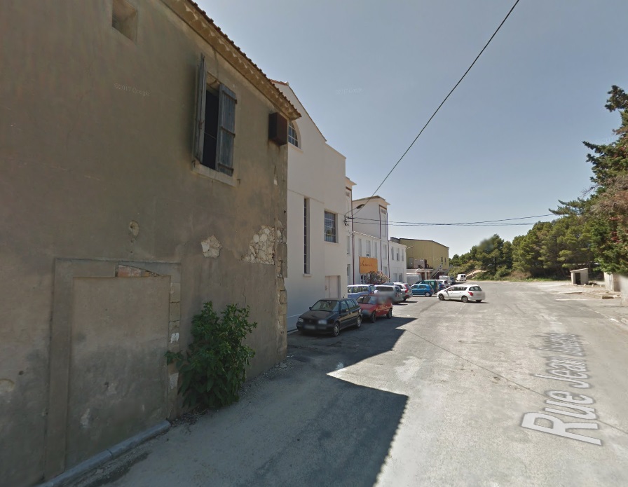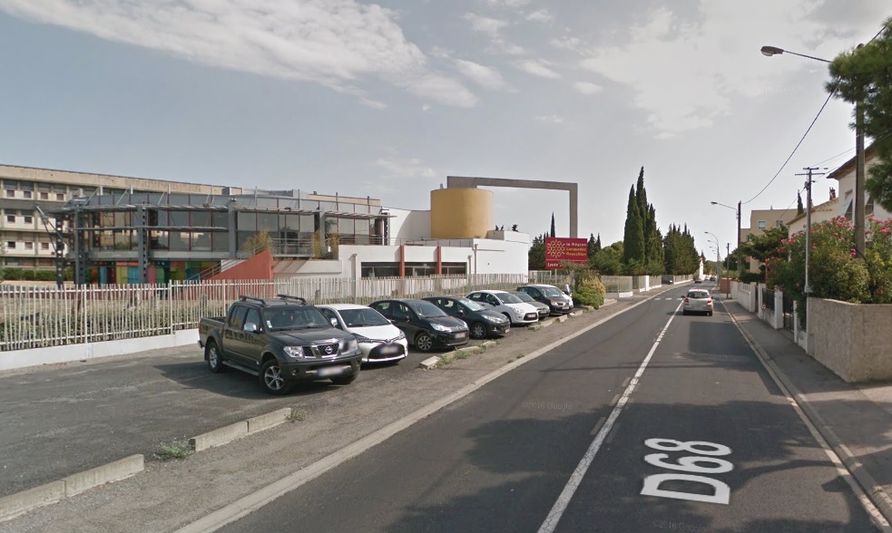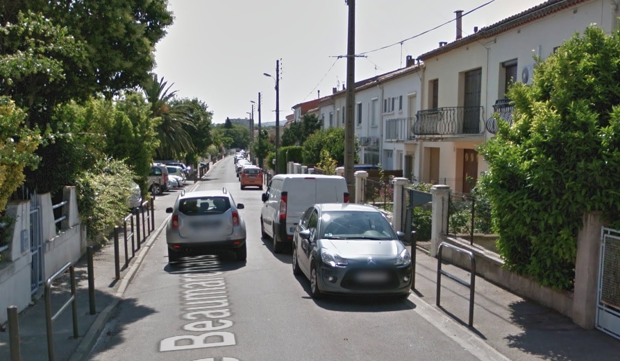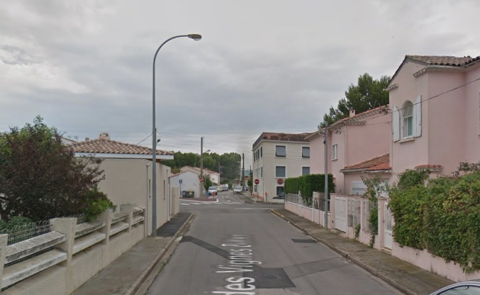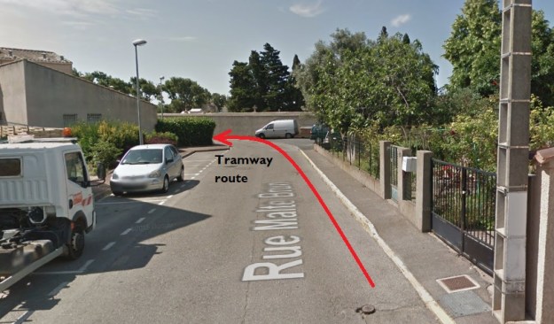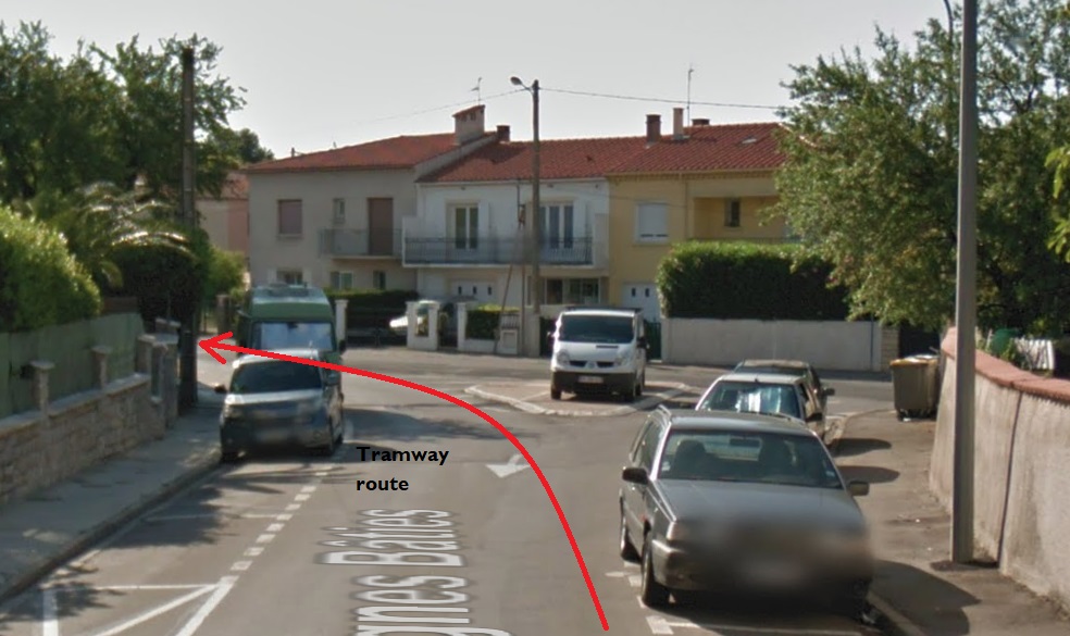 The route to Fleury set off Northeast from the tramway station on the forecourt of the Gare du Midi in Narbonne. After a very short distance the tramway route turned to a more southeasterly direction and in turn, within a short distance, left behind the suburbs of Narbonne.Things in the early 21st century are much different. In the image above the line can be seen leaving the station and heading East. [1] In the image below that line is now a road flanked by domestic dwellings. The cemetery appears to be essentially unchanged.The route as far as Vinnasan is shown on a composite of aerial photographs from 1939 to 1958 below. [1] Most of the route followed what is now the D68 over relatively flat countryside. I have not been able to find any images of the tramway between Narbonne and Vinnasan. The Google Streetview images below show the route of the tramway through what were open fields and are now suburbs of Narbonne.The old road and tramway route are on the left.