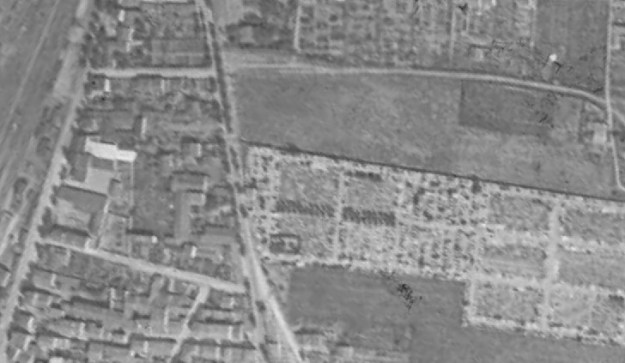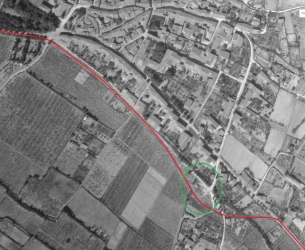 The western entrance to the village is shown on this extract from a 1945 aerial photograph. The tramway station location is highlighted by the green rectangle. By 1945, the station site had already been subsumed into the Co-op site.