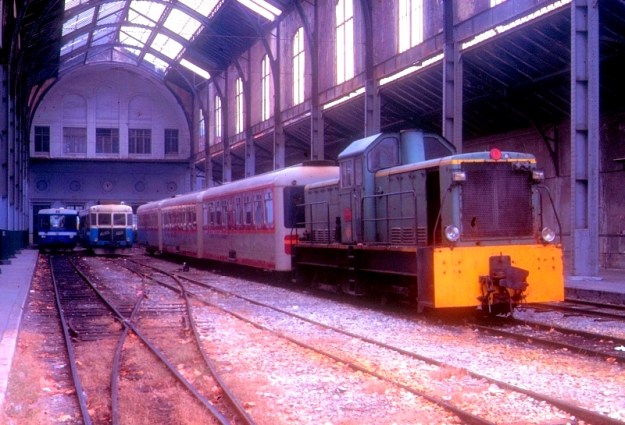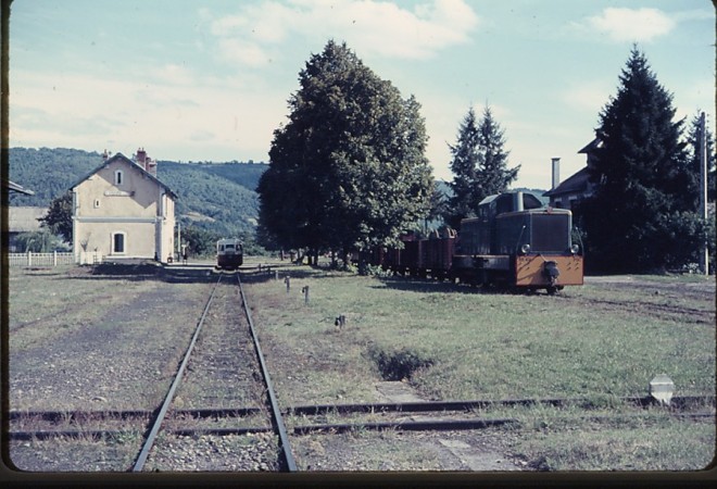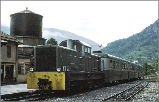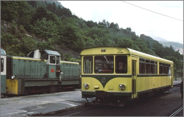 BB402 at Lingostiere in 1985. [18]BB402 at the Gare du Sud in May 1976. [21]Diesel locomotive BB 402 with three passenger cars at the platform in Annot in June 1977, (c) Herbert Graf. [22]An autorail “Ville de Digne” crosses with BB 402 in Annot in June 1977, (c) Herbert Graf. [22]
