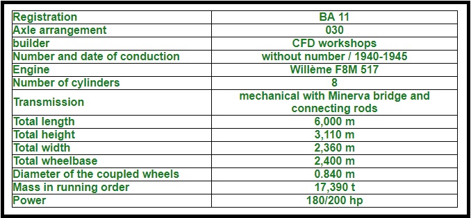 No. 11 was built during the Second World War, based on the chassis of an old steam loco. This transformation was carried out by the C.F.D. The steam loco was itself built in 1885 by the Belgian firm, ‘Couillet’. Work on the conversion started in January 1940 at the C.F.D. workshops in Neuille-Pont-Pierre. It was completed in January 1941. [10]