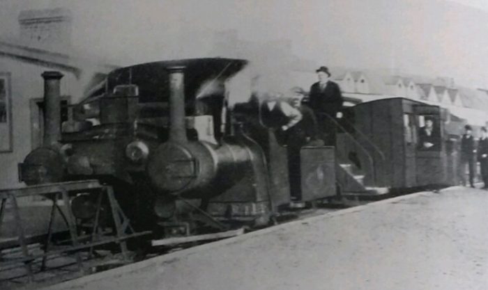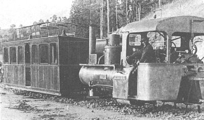 “They were also fitted with powered tenders for auxiliary use on hills. The tender wheels were driven by two cylinders via spur gears. Two small chimneys were fitted to each tender to discharge the exhaust steam from these cylinders. A smaller engine, nicknamed the “coffee pot”, was used in the construction of the railway, having been used previously on a demonstration line at Tothill Fields in London. It can be seen on an early photo of 1888.” [3]