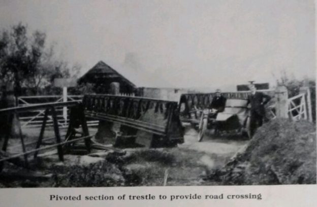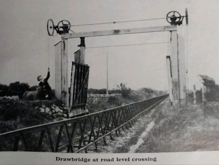 “Where farmers’ tracks crossed the line there were level crossings based on the principle of a turntable. These were locked and the farmer in question provided with a key. Once unlocked, the track could be swivelled to one side to allow the crossing to be used. Both the swivelling and drawbridge type crossings were automatically linked to signals, which stopped any approaching trains; road traffic was always given priority under this system.” [3]