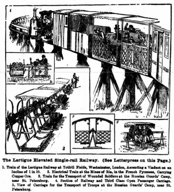 The Lartigue railway system is that of a series of cars drawn by horse-power or a specially constructed locomotive, running on a single rail elevated a few feet from the ground. The system has been in use since 1883 in several parts of Europe and Africa; and a model line has recently been shown in action near Victoria Street, Westminster, London. The main features of the system, which is applicable to military, agricultural, or manufacturing lines, are as follows: