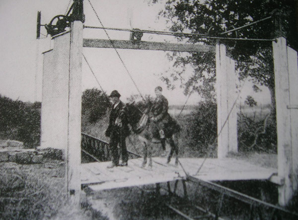 Loads had to be evenly balanced. If a farmer wanted to send a cow to market, he would have to send two calves to balance it, which would travel back on opposite sides of the same freight wagon, thereby balancing each other. Another problem with using the Lartigue system in populated areas was that, due to the track’s design, it was not possible to build level crossings. In order for a road to cross the track, a kind of double-sided drawbridge had to be constructed, which required an attendant to operate it. [3]